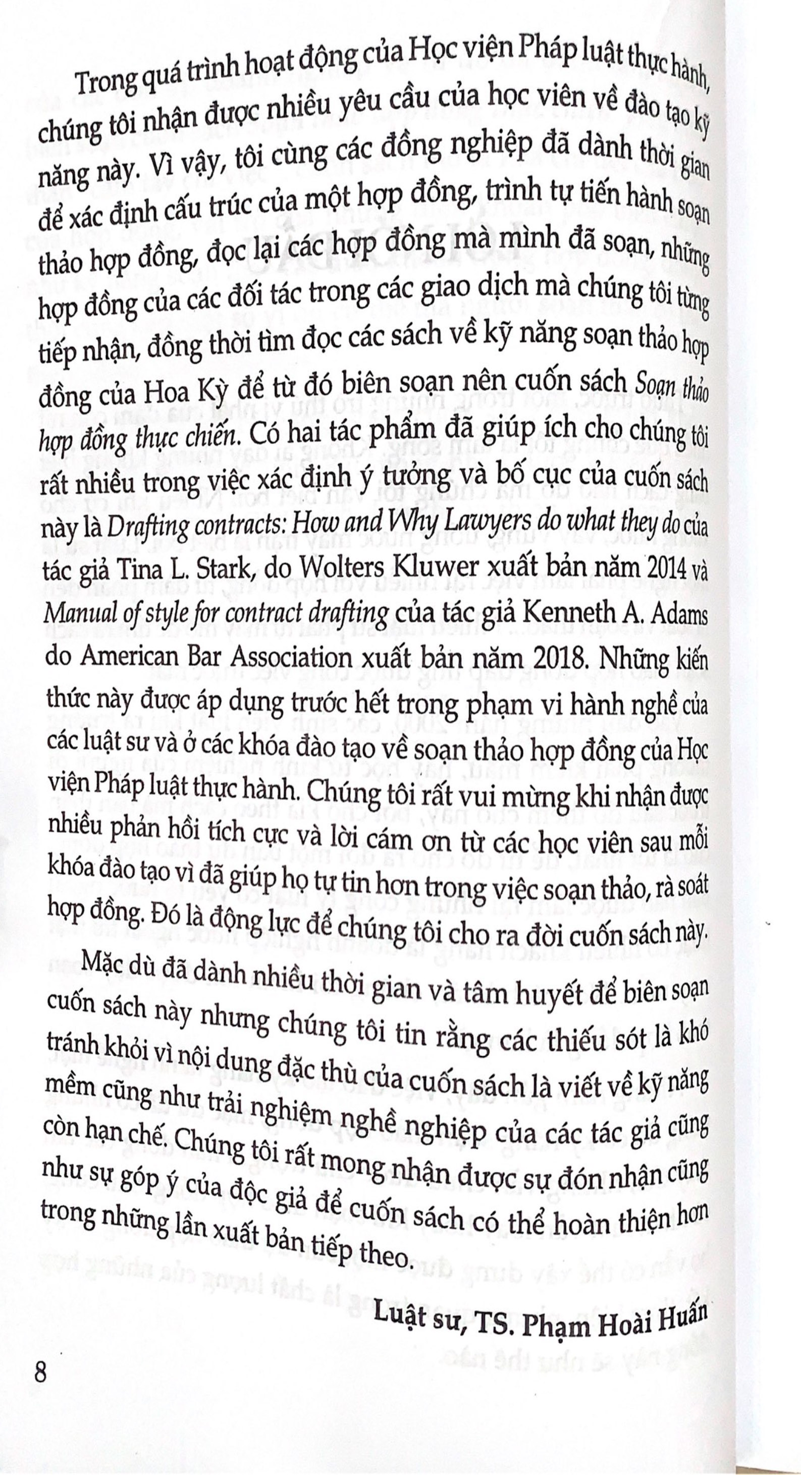 Là Giám đốc Học viện Pháp luật thực hành, một đơn vị cung cấp các khóa đào tạo thực chiến dành cho luật sư thương mại và pháp chế, Luật sư Phạm Hoài Huấn đã nhận thấy tầm quan trọng của việc hướng dẫn kỹ năng soạn thảo hợp đồng cho những người làm công việc soạn thảo hợp đồng của các đơn vị, doanh nghiệp và từ đó đã dành tâm huyết biên soạn cuốn sách “Soạn thảo hợp đồng thực chiến”. Trên tinh thần “cầm tay chỉ việc”, cuốn sách mô tả khá chi tiết cấu trúc của hợp đồng, vai trò của những điều khoản phổ biến cũng như kỹ năng soạn thảo các điều khoản trong hợp đồng, đồng thời cung cấp một số ví dụ cụ thể mà người soạn thảo có thể tham khảo.