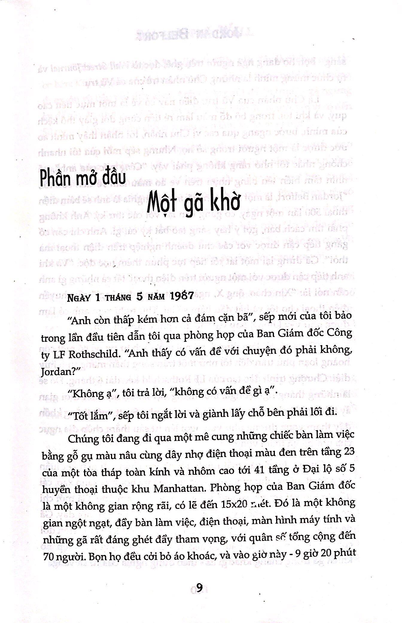 Được mọi người gọi với nhiều biệt danh, trong đó, cái tên Sói Già Phố Wall là hợp với Jordan hơn cả - một con sói tối thượng đội lốt cừu non. Ngoại hình và cách hành xử của anh ta trông giống như một đứa trẻ nhưng thực chất, anh ta đâu có trẻ con. Anh ta là một thằng đàn ông ba mươi mốt tuổi nhưng già đời như một lão sáu mươi, "sống theo thang tuổi của loài chó" - một năm bằng bảy năm tuổi người.Vừa tốt nghiệp đại học, bước vào khởi nghiệp, Jordan Belford đã gặp ngay thất bại đầu đời trên phố Wall, bởi anh ta mới chỉ là “cừu non” giữa bao “sói già” khác vây quanh. Chàng trai có cặp mắt xanh, cái miệng dẻo quẹo, cao chỉ tầm một thước bảy chẳng còn cách nào khác, phải chuyển hướng để kiếm việc. Anh ta tìm đến một công ty bé xíu để thử vận may.