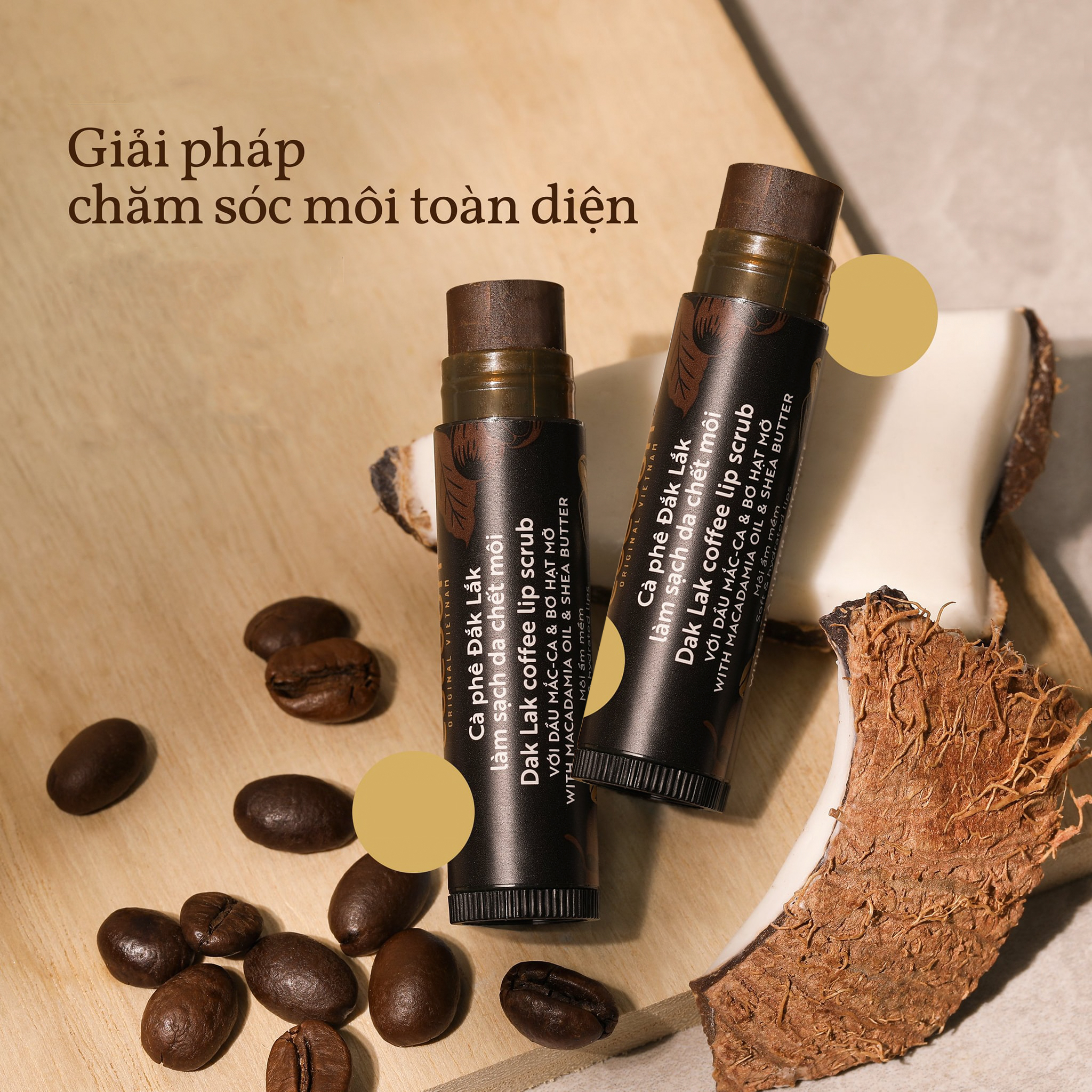 Cà phê đắk lắk làm sạch da chết môi cocoon. những hạt cà phê li ti được rang xay bằng tay hòa quyện vào dầu mắc-ca và bơ hạt mỡ, sẽ nhẹ nhàng làm bong