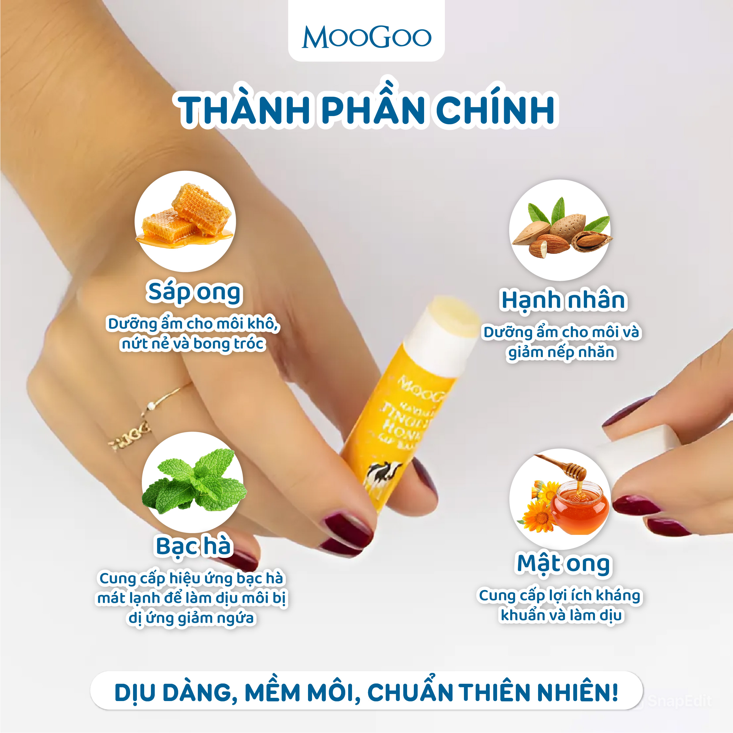 Son dưỡng môi MooGoo với các thành phần từ thiên nhiên thuần khiết, chăm sóc hằng ngày cho đôi môi mềm mại và mịn màng.