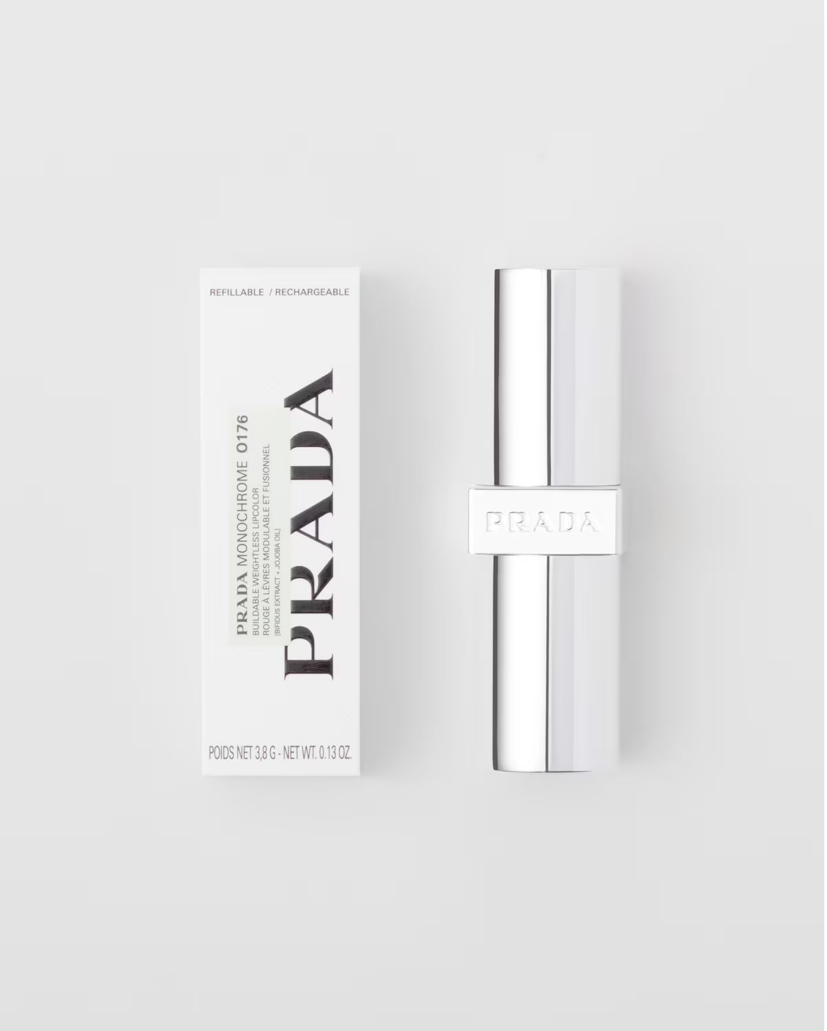 - Thiết kế bằng kim loại nguyên khối màu bạc kim sáng bóng siêu sang chảnh cùng với thiết kế nắp nam châm chắc chắn vô cùng sang trọng - Chất son của Prada Monochrome khắc phục hoàn toàn khuyết điểm của son lì thông thường, không bột, không lộ vân, không gây khô môi