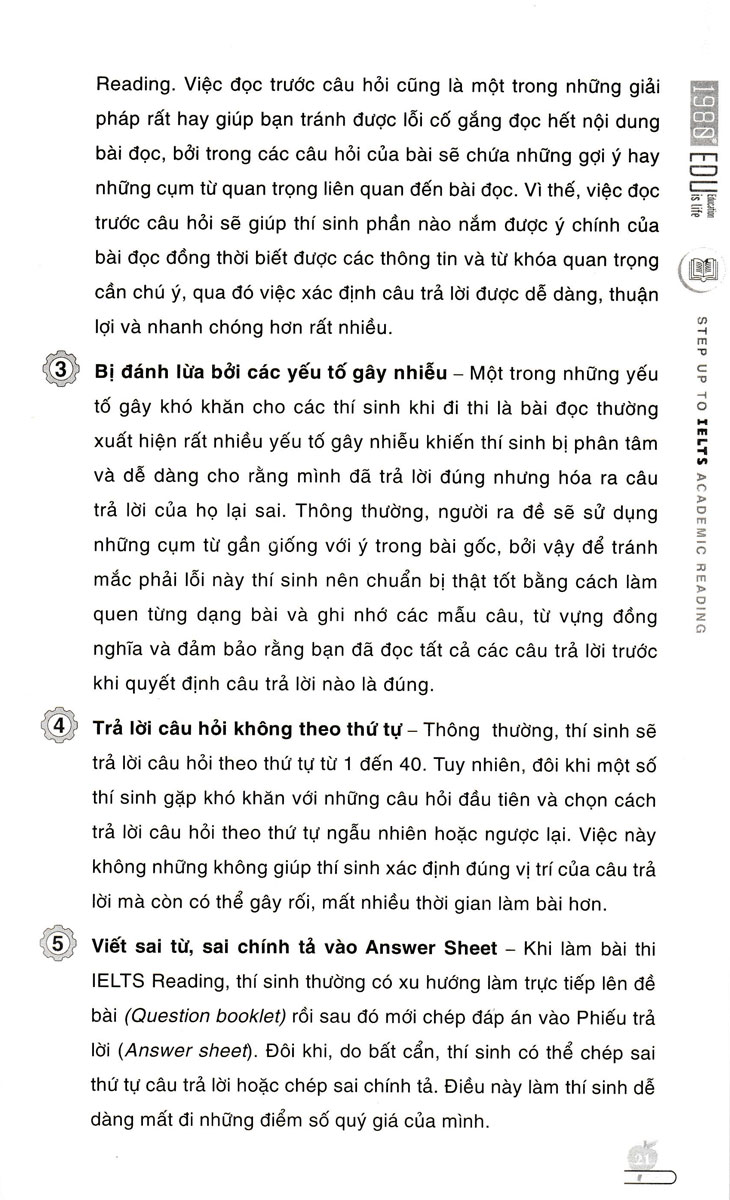 Cuốn sách “Step Up To IELTS Academic READING” nằm trong bộ sách “Step up to IELTS Academic” là bộ sách gồm bốn kỹ năng “listening/ speaking/ reading/ writing” được cô đọng kiến thức và hỗ trợ tối đa cho thí sinh trong việc làm quen dạng đề và nhận diện dạng bài. Đặc biệt là định hình và xây dựng thói quen, phương pháp học tập hiệu quả để hệ thống kiến thức, dành cho người mới bắt đầu và muốn ôn luyện chuyên sâu; tổng hợp đầy đủ nhất các dạng bài trong đề thi IELTS. Thí sính sẽ dễ dàng nắm bắt được trọng điểm kiến thức để học nhanh nhớ lâu.