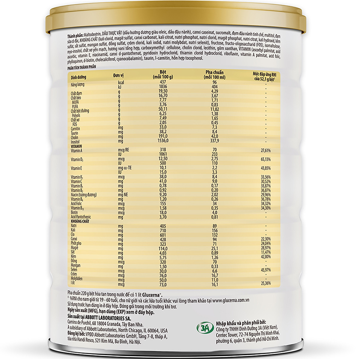 - Phối hợp độc đáo các dưỡng chất bao gồm Fructo-oligosaccharid (FOS) giúp giảm cân nặng và vòng eo. Cung cấp dinh dưỡng đầy đủ và cân đối cho người đái tháo đường Sản phẩm đã được chứng minh lâm sàng và cung cấp dinh dưỡng đầy đủ và cân đối cho người đái tháo đường. Sản phẩm giúp bạn tự tin hơn với cơ thể khỏe mạnh lâu dài, hạn chế sự phát triển những triệu chứng của đái tháo đường cho thói quen ăn uống không hợp lý. Có thể thay thế toàn phần bữa ăn chính Sữa Bột Abbott Glucerna được nghiên cứu và chứng minh thực tế có thể dùng thay thế toàn phần bữa ăn chính hoặc để làm bữa ăn phụ. Sản phẩm giúp bạn gỡ bỏ mối lo lựa chọn thực phẩm, chế độ ăn mỗi ngày, đặc biệt hữu ích khi cần chuẩn bị bữa ăn khi đi xa, du lịch. Hướng dẫn sử dụng