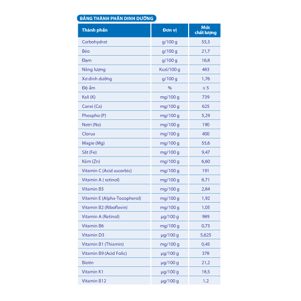 THÀNH PHẦN: Sữa bột nguyên kem bổ sung Vitamin A và D3, bột sữa (bột sữa tách béo, hỗn hợp dầu thực vật (dầu cọ, dầu bắp, dầu hạt cải, dầu hướng dương), glucose syrup,