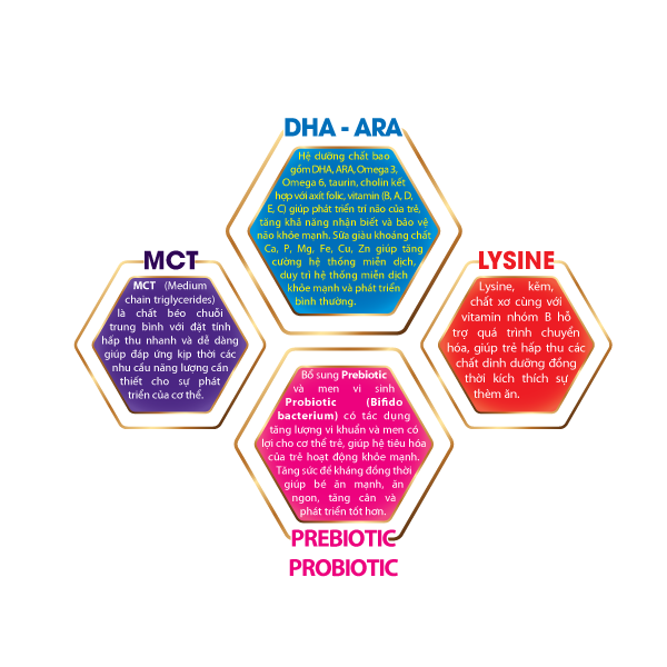 Omega 3 & Omega 6 Các dưỡng chất thiết yếu như DHA - TAURIN - CHOLIN - LUTEIN - AXIT FOLIC - LUTEIN - KHOÀNG CHẤT - Axít F giúp phát triển trí não của bé, tăng cường khả năng nhận biết và bảo vệ não khỏe mạnh.