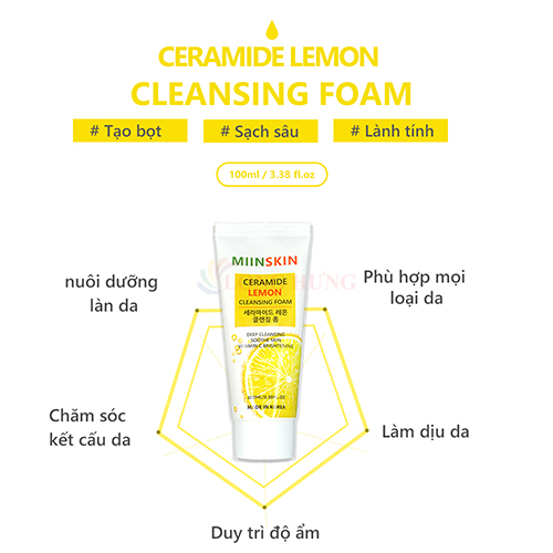Sữa rửa mặt chanh MIINSKIN Ceramide Lemon Cleansing Foam là sản phẩm làm sạch da hiệu quả. Với chiết xuất chanh tươi và Ceramide, sản phẩm giúp loại bỏ bụi bẩn, dầu thừa, đồng thời dưỡng ẩm và làm sáng da, mang lại làn da sạch thoáng, mềm mại.