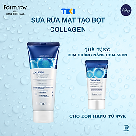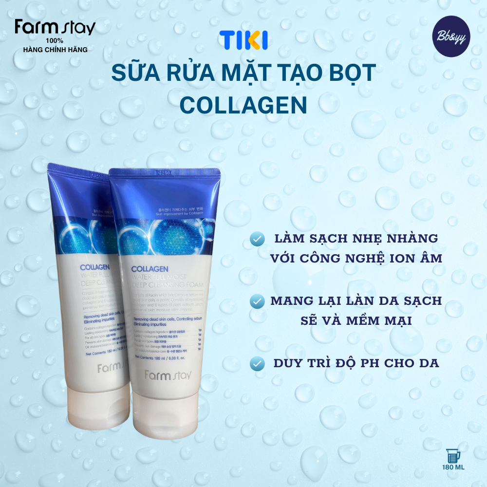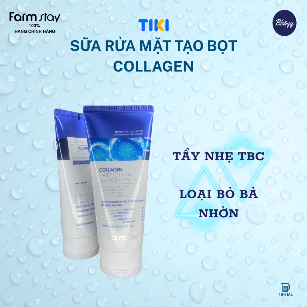 SỮA RỬA MẶT TẠO BỌT COLLAGEN _ COLLAGEN WATER FULL MOIST DEEP CLEANSING FOAM THÀNH PHẦN: xem trên bao bì sản phẩm. CÔNG DỤNG:    - Làm sạch nhẹ nhàng lớp trang điểm và các tác động bên ngoài suốt cả ngày với công nghệ ion âm.   - Giúp cân bằng độ pH da, giúp da ẩm mượt, dịu mát sau khi rửa mặt.   - Giúp da tẩy nhẹ TBC và bả nhờn sâu trong lỗ chân lông.   - Tăng cường dưỡng chất chống oxy hóa da và cải thiện nếp nhăn da. HƯỚNG DẪN SỬ DỤNG:    - Làm ướt mặt bằng nước sạch, lấy một lượng nhỏ sữa rửa mặt vào lòng bàn tay và tạo bọt sau đó nhẹ nhàng thoa và massage bọt lên mặt theo chuyển động tròn. Rửa mặt sạch lại bằng nước sạch. LƯU Ý KHI SỬ DỤNG:   - Khi sử dụng sản phẩm hoặc sau khi sử dụng, nếu vùng da sử dụng bị kích ứng hay tác dụng phụ do ánh nắng trực tiếp, hãy ngừng sử dụng và tham khảo ý kiến chuyên gia hoặc bác sĩ chuyên khoa.   - Không sử dụng trên vùng da bị thương và vết thương hở.   - Tránh xa tầm tay trẻ em vật nuôi và tránh ánh nắng trực tiếp lên sản phẩm.   - Sử dụng trong vòng 6 tháng sau khi mở nắp ( mở seal ) và đậy nắp kín sau khi sử dụng.   - Bảo quản sản phẩm ở nhiệt độ thường. Ngày SX & HSD: xem trên bao bì sản phẩm. Dung tích: 180ml. Nhà SX: Farmstay - Hàn Quốc. Nhà NK & PP: Công Ty TNHH BB&YY ( Beauty and Young). SCB: 239809/24/CBMP-QLD.