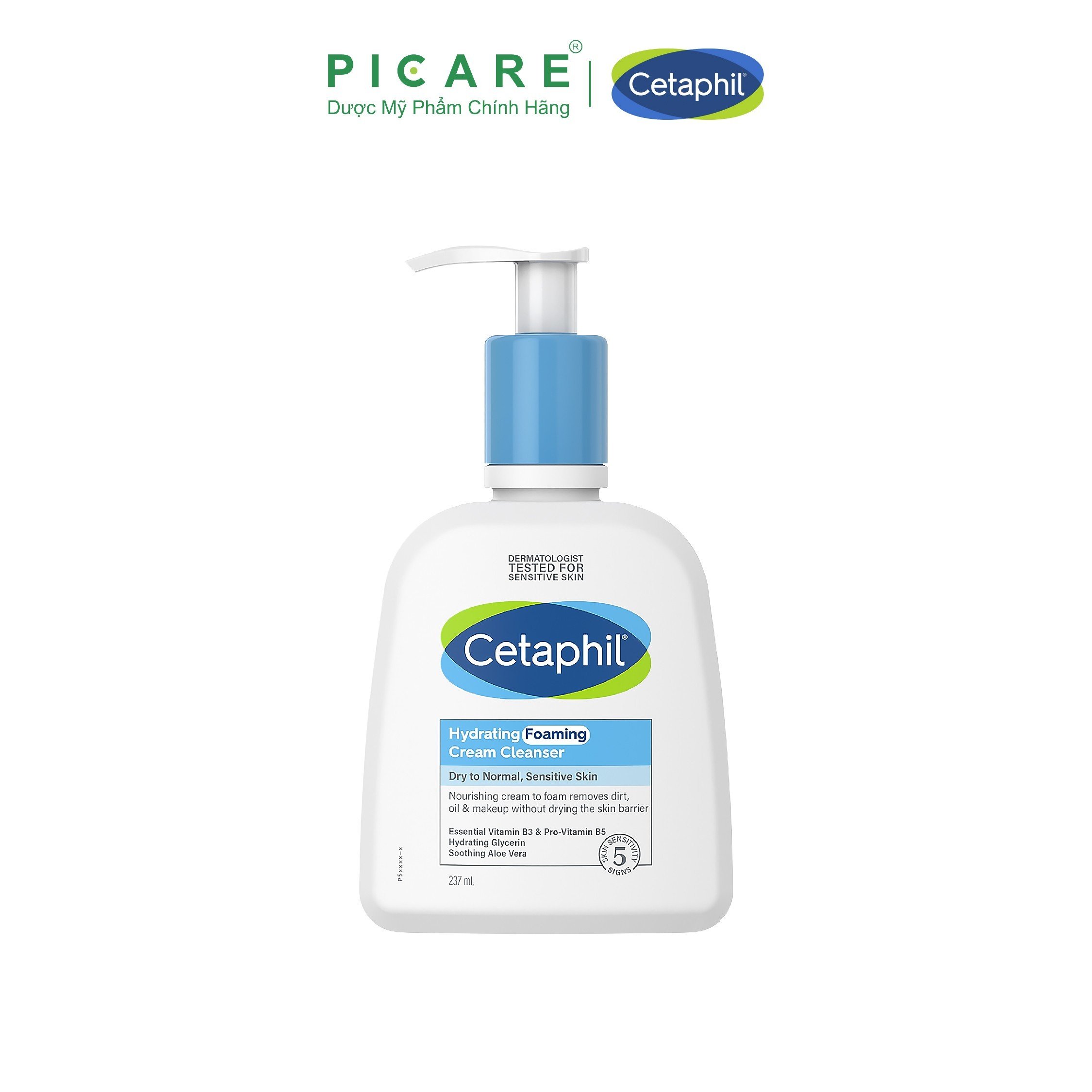 Mua tại TiktokSữa Rửa Mặt Tạo Bọt Dịu Lành Cho Da Nhạy Cảm Cetaphil Hydrating Foaming Cream Cleanser dạng kem tạo bọt mịn, giúp làm sạch mà không gây khô da. Sản phẩm được chứng minh lâm sàng giúp loại bỏ bụi bẩn, dầu làm tắc lỗ chân lông. THÀNH PHẦN Water, Sodium Cocoyl Isethionate, Glycerin, Glycol Distearate, Sodium Cocoyl Glutamate, Cocamidopropyl Betaine, Sodium Lauroyl Sarcosinate, Cetearyl Alcohol, Phenoxyethanol, Acrylates/C10-30 Alkyl Acrylate Crosspolymer, Arginine, Propylene Glycol, Sodium Chloride, Xanthan Gum, Ethylhexylglycerin, Niacinamide, Panthenol, Aloe Barbadensis Leaf Juice Powder, Pantolactone, Citric Acid CÔNG DỤNG CÔNG THỨC KHOA HỌC DỊU LÀNH CHO LÀN DA NHẠY CẢM