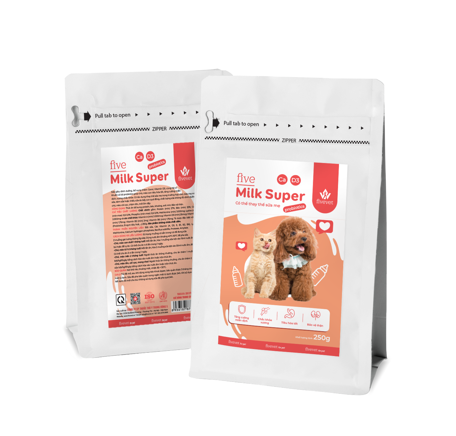 Mua tại TiktokSữa Tăng Cường Miễn Dịch five Milk Super For Pet Cho Thú Cưng 250g - Fivevet ️CÔNG DỤNG: Five-Milk super (for pet) là sản phẩm sữa giàu dinh dưỡng, bổ sung thêm Canxi, Vitamin D3, cùng hệ vi khuẩn có lợi probiotics giúp chó, mèo con tiêu hóa tốt, tăng cường miễn dịch, xương chắc khỏe. Có tác dụng thay thế sữa mẹ trong trường hợp chó, mèo mẹ mất sữa, kém sữa hoặc thiếu sữa do bầy con quá đông, chất lượng sữa không đủ dinh dưỡng; chó, mèo còi cọc, chậm lớn, mới ốm dậy.