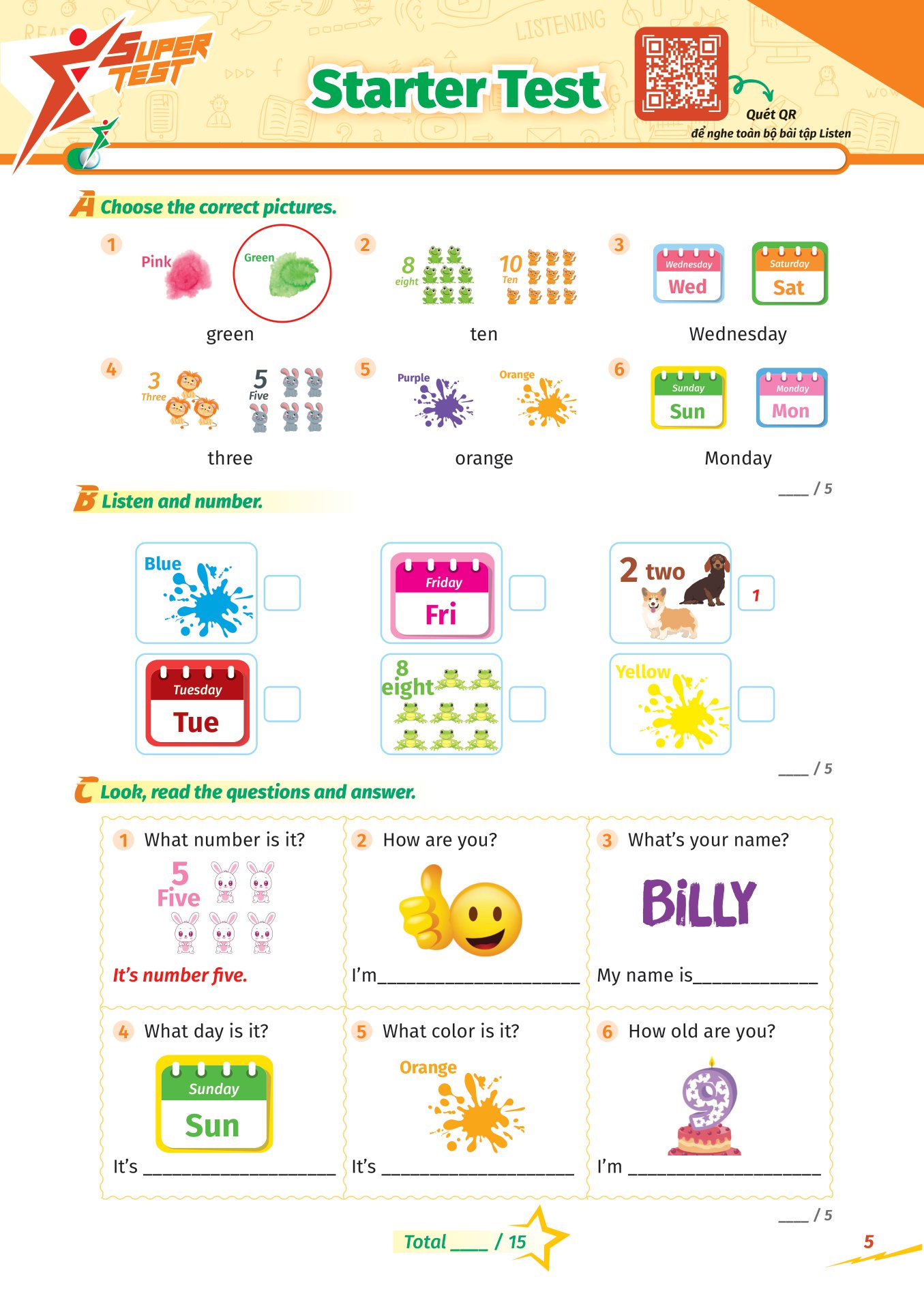 - Đáp án chi tiết Các bài kiểm tra đều có kèm đáp án chi tiết để thầy cô cũng như bố mẹ có thể dựa vào đó để tự chấm điểm các bài kiểm tra, đánh giá được năng lực của con mình Với Bộ sách Super Test – Đề kiểm tra nhanh Tiếng Anh cho học sinh, bố mẹ sẽ giúp con tiến bộ từng ngày, tự tin với khả năng ngôn ngữ của mình khi ôn luyện Tiếng Anh bởi các bài tập về 4 kỹ năng: Nghe – Nói – Đọc – Viết được liên kết với nhau theo logic của bài học.