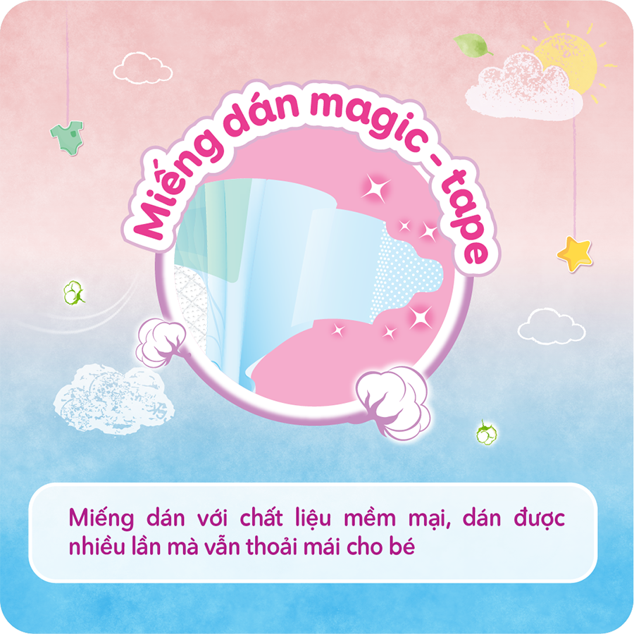 - Miếng dán Magic-tape siêu mềm Miếng dán với chất liệu mềm mại, dán được nhiều lần mà vẫn thoải mái cho bé