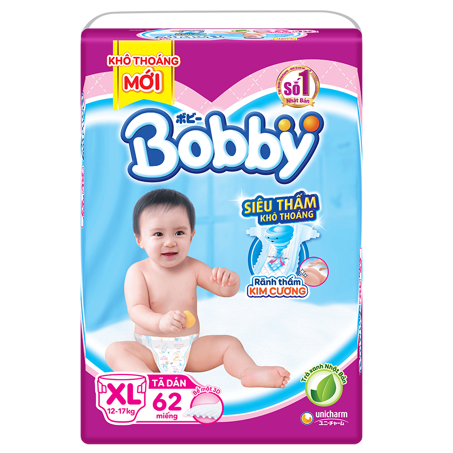 - size XXL: > 16 kg. Gói: 32 miếng - 56 miếng Thông tin thương hiệu Bobby – Thương hiệu tã trẻ em chất lượng đến từ Nhật Bản tự hào là thành viên thuộc tập đoàn Unicharm – Nhà sản xuất tã em bé số 1 được tin dùng bởi các bà mẹ Nhật Bản. Trong hơn 17 năm qua tại thị trường Việt Nam, Bobby được lựa chọn đồng hành cùng hàng triệu em bé từ những ngày đầu tiên chào đời. Bobby cung cấp cho mẹ Việt các sản phẩm tiện lợi từ miếng lót sơ sinh, tã dán sơ sinh, khăn giấy ướt, tã quầ Sử dụng thế mạnh là thành viên của tập đoàn hàng đầu thế giới, các sản phẩm mang thương hiệu Bobby đều được áp dụng dây chuyền sản xuất độc quyền đến từ Unicharm Nhật Bản. Bobby trong lòng người dùng Việt chính là thương hiệu uy tín và thấu hiểu, đồng hành cùng con nhỏ ngay từ lúc chào đời.