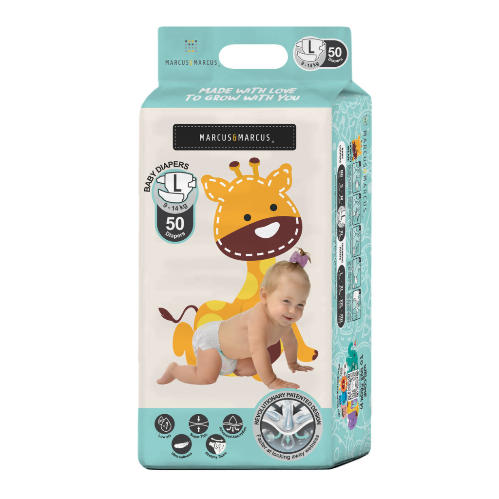 Size L: 50 miếng tã dán Marcus & Marcus dành cho bé từ 9 – 14kg.