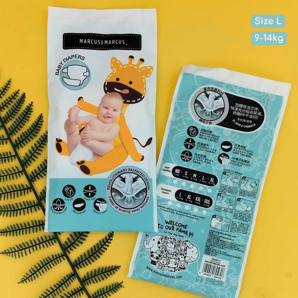 Size L: 1 miếng tã dán Marcus & Marcus dành cho bé từ 9 – 14kg mỗi gói.