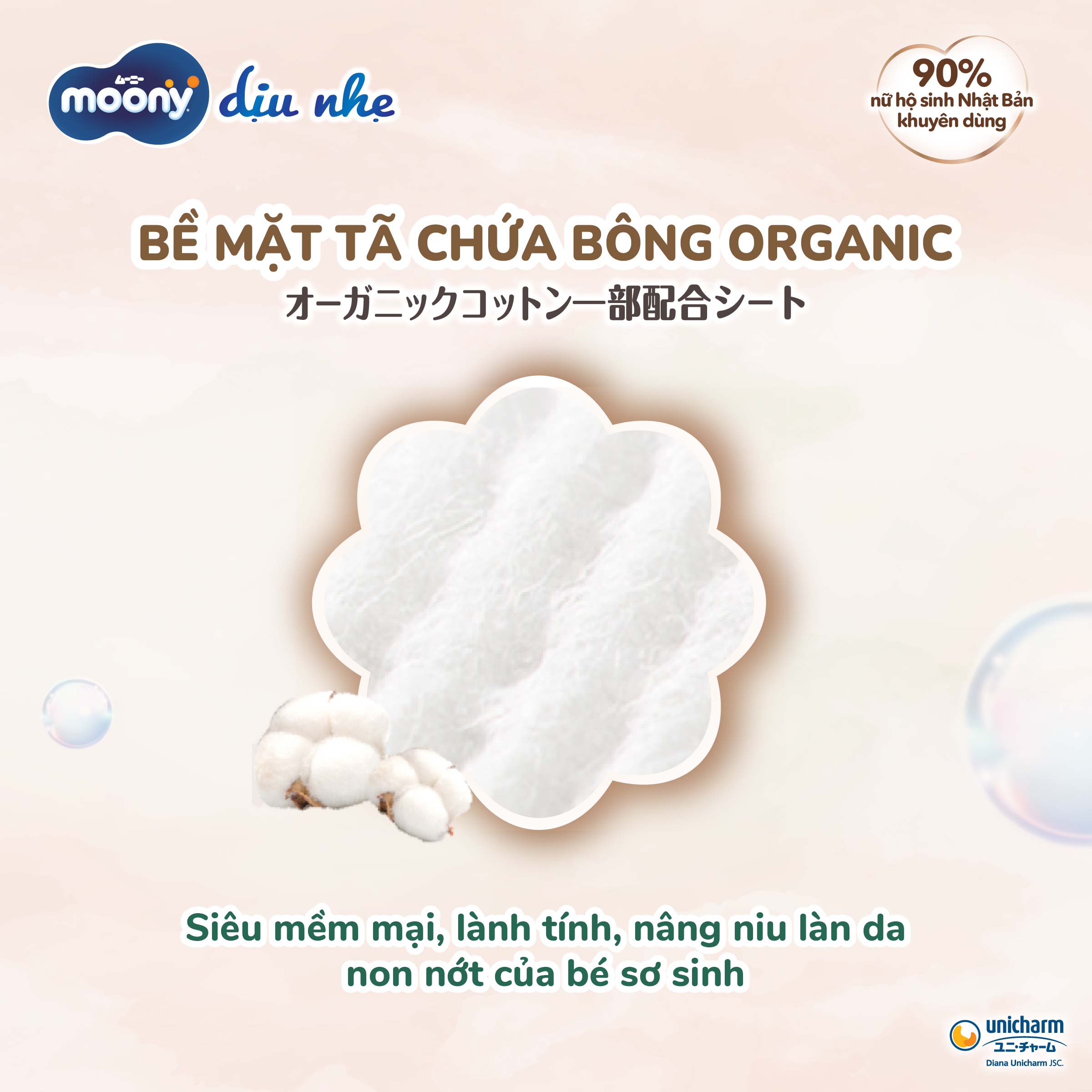 • Bề mặt tã chứa bông Organic cotton êm mềm, an tâm cho làn da non nớt của bé sơ sinh