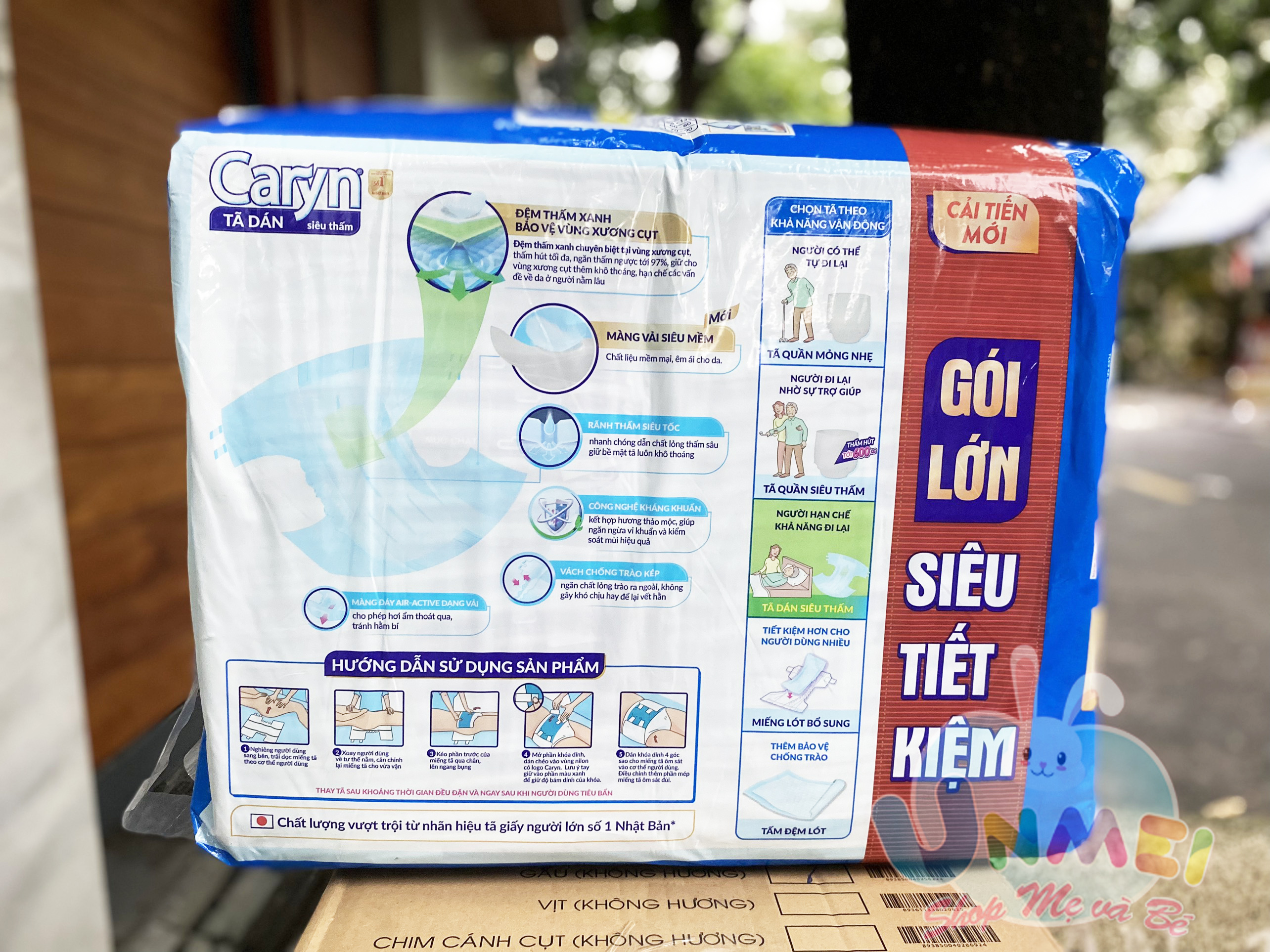 Mô Tả Sản Phẩm Tã Dán người lớn Caryn Gói Lớn Tã dán Siêu thấm Caryn cải tiến mới với “Đệm thấm xanh" chuyên biệt tại vùng xương cụt, với các hạt thấm hút tăng