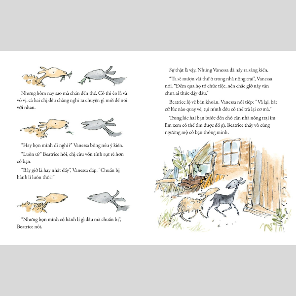 Ngày nào cũng như ngày nào, chị cừu Beatrice và chị dê Vanessa cùng nhai chóp chép, cùng tán chuyện trên đồng cỏ quen thuộc. Một hôm, hơi chán, hai chị rủ nhau lên đường đi nghỉ, chỉ mang theo vài quả bóng bay và một thứ còn lạ lùng hơn, ngạc nhiên thay, cả hai đều trở nên hữu ích bất ngờ… Chuyện gì sẽ xảy ra tiếp theo nhỉ? Hãy theo dõi cuốn sách tuyệt hay này nhé!