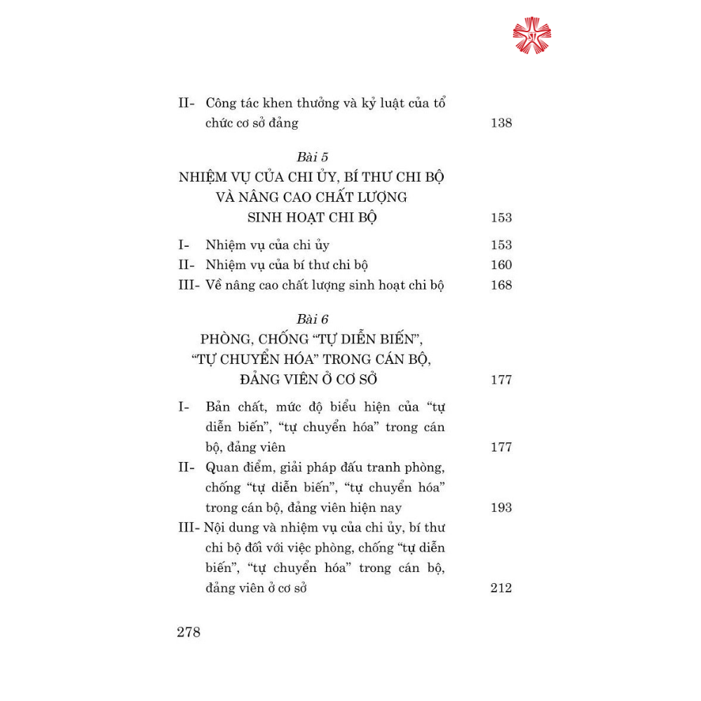 Mua tại TiktokNội dung cuốn sách gổm 6 bài, cung cấp những kiến thức cơ bản về tổ chức cơ sở đảng và thực hiện nhiệm vụ chính trị của các loại hình tố chức cơ sở đảng: nhiệm vụ của chi ủy, bí thư chi bộ và nâng cao chất lượng sinh hoạt chi bộ: hướng dẫn nghiệp vụ công tác của tổ chức cơ sở đảng: công tác tư tưởng; công tác tổ chức; công tác dân vận; công tác kiểm tra, giám sát và công tác khen thưởng, kỷ luật; phòng, chống "tự diễn biến”, “tự chuyển hóa" trong cán bộ, đảng viên ở cơ sở Đồng thời, phần phụ lục cung cấp một số mẫu văn bản về công tác tổ chức, công tác kiểm tra, giám sát của tổ chức đảng ở cơ sở.