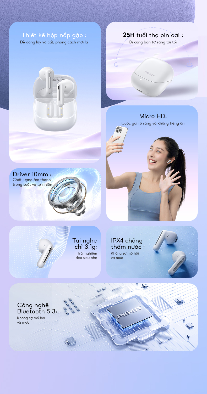 Tai nghe Bluetooth PISEN C2 ANC ENC True wireless ( Màu trắng) - Hàng chính hãng, bảo hành 18 tháng Nâng cấp lớn về thính giác - Nhỏ và nhẹ trên tai Thiết kế hộp nắp gập : dễ dàng lấy và cất, phong cách mới lạ Tuổi thọ pin dài : đi cùng bạn từ sáng tới tối Micro hd : cuộc gọi rõ ràng và không tiếng ồn Cuộn dây lớn 10mm : chất lượng âm thanh trong suốt và tự nhiên Tai nghe chỉ 3.1g : trải nghiệm đeo siêu nhẹ Ipx4 chống thấm nước : không sợ mồ hôi và mưa Công nghệ bluetooth 5.3 : kết nối nhanh chóng không chờ đợi Thiết kế buồng cửa mở Bật nhẹ để bắt đầu hành trình âm nhạc Ngăn sạc bán mở kiểu buồng lái sáng tạo của pisen, âm nhạc sẽ nhẩy múa xung quanh bạn ngay khi mở nắp Từ tính siêu mạnh – lấy và cất mượt – cảm giác mượt mà Nhẹ nhàng và dễ chịu Không cảm giác, thoải mái hơn khi đeo Thiết kế gọn nhẹ, tự nhiên và vừa vặn với vành tai, đeo như không đeo (ý nó nói là nhẹ, không gây khó chịu) 3.1g giải phóng áp lực ở cả 2 tai Rẻ mà hay Chất lượng âm thanh hifi, sóng âm dâng trào, như đang ở hiện trường Cuộn dây động kích thước lớn 10mm và màng ngăn polymer Giảm tiếng ồn cuộc gọi enc Tránh xa tiếng ồn, giao tiếp thoải mái Tích hợp micro hd, nhận chính xác giọng nói, bất kể tiếng ồn của gió hay tầu điện ngầm, các cuộc gọi đều có độ phân giải cao luôn lọc bỏ tiếng ồn Chống ồn chủ động ANC Tận hưởng âm nhạc và trò chuyện với bạn bè thoải mái ngay cả khi trong môi trường ồn ào Thời lượng pin 25h Luôn sẵn sàng cho cả ngày Được trang bị ngăn chứa pin, toàn thời lượng pin là 25h, du lịch / đi lại / tập thể dục, tạm biệt nỗi lo về pin Dữ liệu từ pisen lab và chỉ mang tính tham khảo, thực tế có thể khác do môi trường và cách sử dụng Tai nghe tốt luôn hiểu ý bạn Điều khiển mượt chỉ bằng một cú chạm Chạm vào vùng cảm ứng, điều khiển tai nghe, trả lời cuộc gọi và tùy chỉnh nhạc, thiết kế tiện lợi Pause/ play : bấm đúp vào tai phải / trái Chuyển bài trước : nhấn và giữ tai trái (L) 1.5 giây Trả lời / cúp máy : bấm đúp vào tai trái hoặc phải Chuyển bài tiếp theo : nhấn và giữ tai phải (R) 1.5 giây Trải nghiệm mới về âm nhạc chất lượng Kết nối ngay sau khi mở nắp, đeo và nghe Công tắc được tích hợp, mở nắp tai nghe và kết nối tự động, nhấc lên và sử dụng, thoải mái hơn Không sợ mồ hôi và mưa Chống thấm ipx4, không sợ mồ hôi và mưa, tập luyện không lo lắng Đừng để phân tâm khi tập luyện, thưởng thức âm nhạc một cách trọn vẹn (background music – nhạc nền) THÔNG SỐ KỸ THUẬT: Tên sản phẩm : Tai nghe không dây True Wireless PISEN C2  Mã sản phẩm: bhd-tw7 Kết nối: không dây bluetooth v5.3 Khoảng cách bluetooth 10m (môi trường mở không rào cản) Giải mã âm thanh : sbc, aac Giao diện hộp sạc:  type-c Độ nhậy của loa 104 ± 3db Dải tần số 20hz-20khz Độ nhậy của micro : -18.92db ± 3db Dung lượng pin tai nghe 28mah 2 Dung lượng pin ngăn sạc 220mah Thời gian sạc ngăn sạc khoảng 1.5h Trọng lượng sản phẩm : tai nghe đơn 3.1g, ngăn sạc khoảng 29.8g, tổng trọng lượng khoảng 35gĐộ nhậy của micro : -18.92db ± 3db