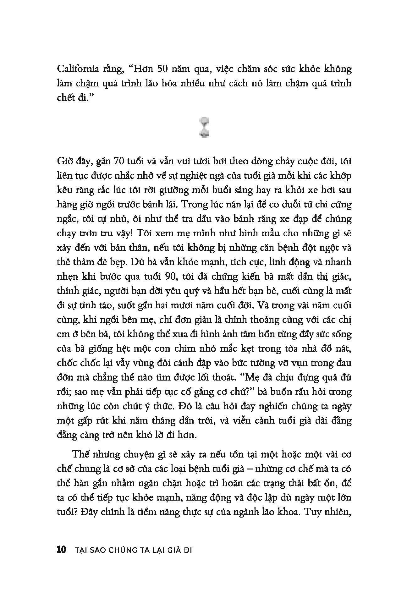 Lão hóa là vấn đề mà tất cả chúng ta đều quan tâm, tuy nhiên chưa có sự đồng thuận và thống nhất giữa các nhà khoa học về nguyên nhân và cơ chế của quá trình này. Có người thì cho rằng đó là quá trình hao mòn cơ bản, người thì tin rằng đây là quy luật được lập trình sẵn để kiểm soát về mặt di truyền, thậm chí có người tin rằng lão hóa là bệnh, có thể được đều ị nhằm kéo dài tuổi thọ đến vô tận… Trong cuốn sách này, Sue Armstrong sẽ kể câu chuyện về quá trình tìm hiểu sự lão hóa; trình bày các nghiên cứu, phát kiến mới nhất của khoa học về quá trình này.