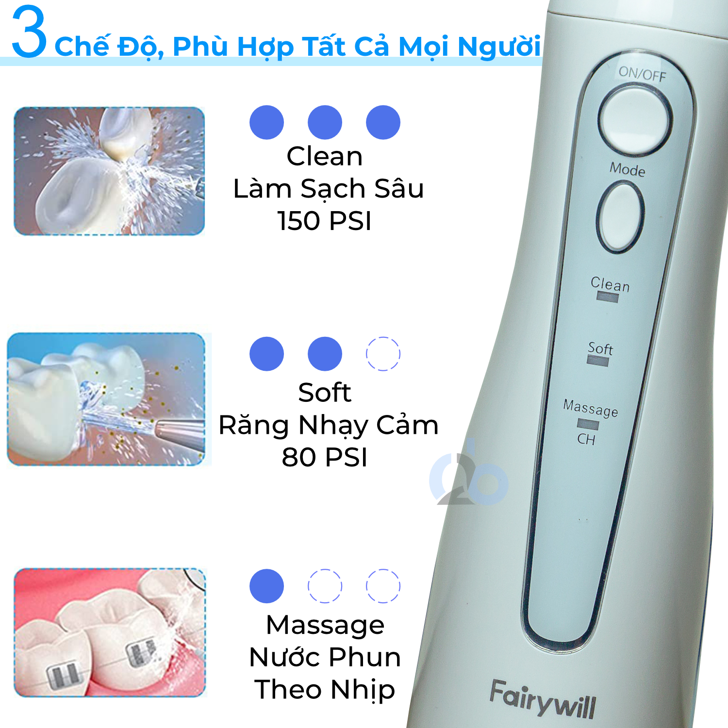 - 3 chế độ phun nước : mát xa, nướu nhạy cảm, và chế độ làm sạch sâu.