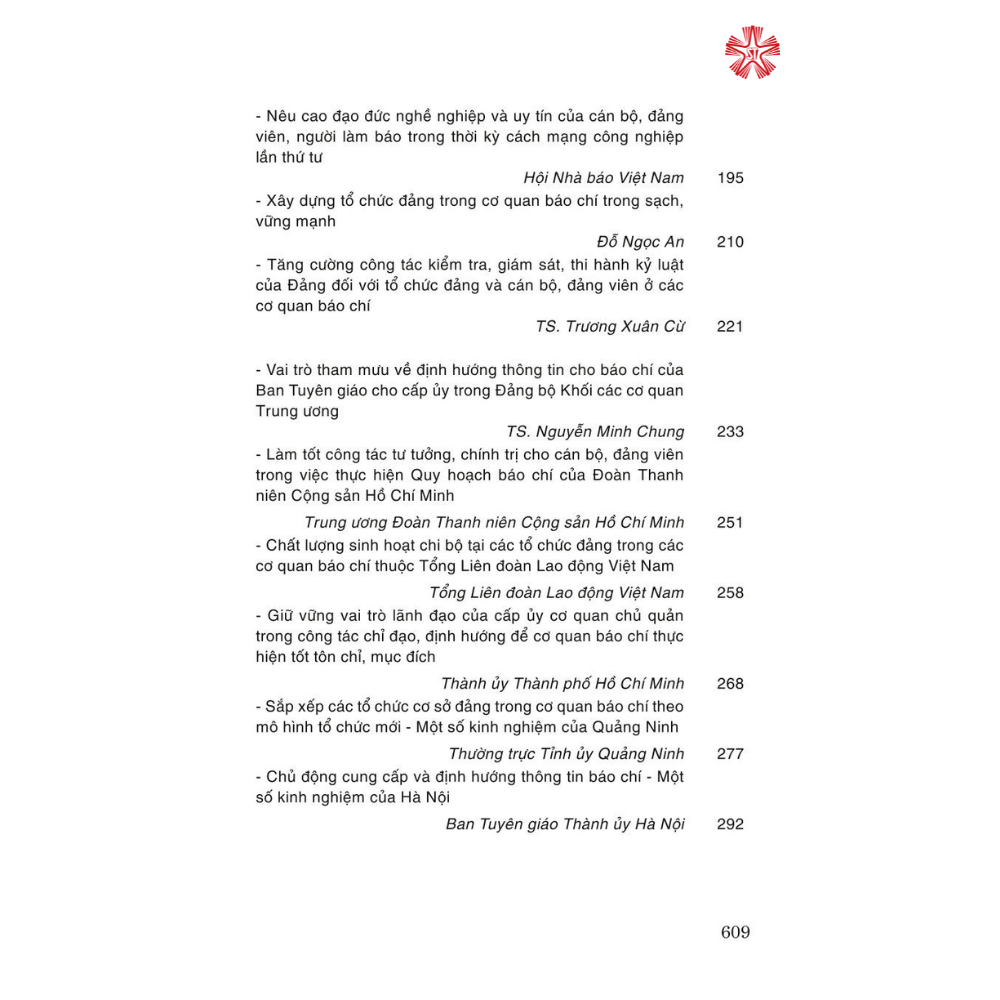 Cuốn sách tập hợp các bài tham luận trong Hội thảo khoa học “Tăng cường công tác xây dựng Đảng trong các cơ quan báo chí”, do Ban Tuyên giáo Trung ương Đảng chủ trì,