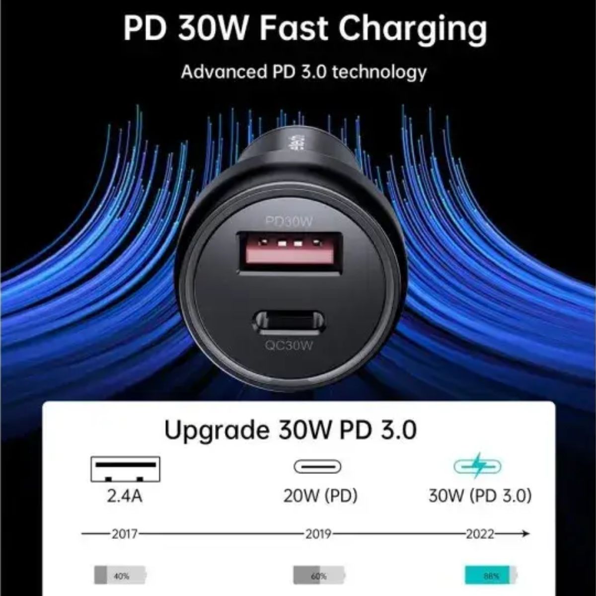 Thông số kỹ thuật Thương hiệu: Baseus Chất liệu: Hợp kim nhôm. + PC Đầu vào: DC 12V - 24V Bản 2U + 2C: USB output: 5V/3A; 9V/2A; 10V/2A; 12V/2.5A 30W Type C output: 5V/3A;