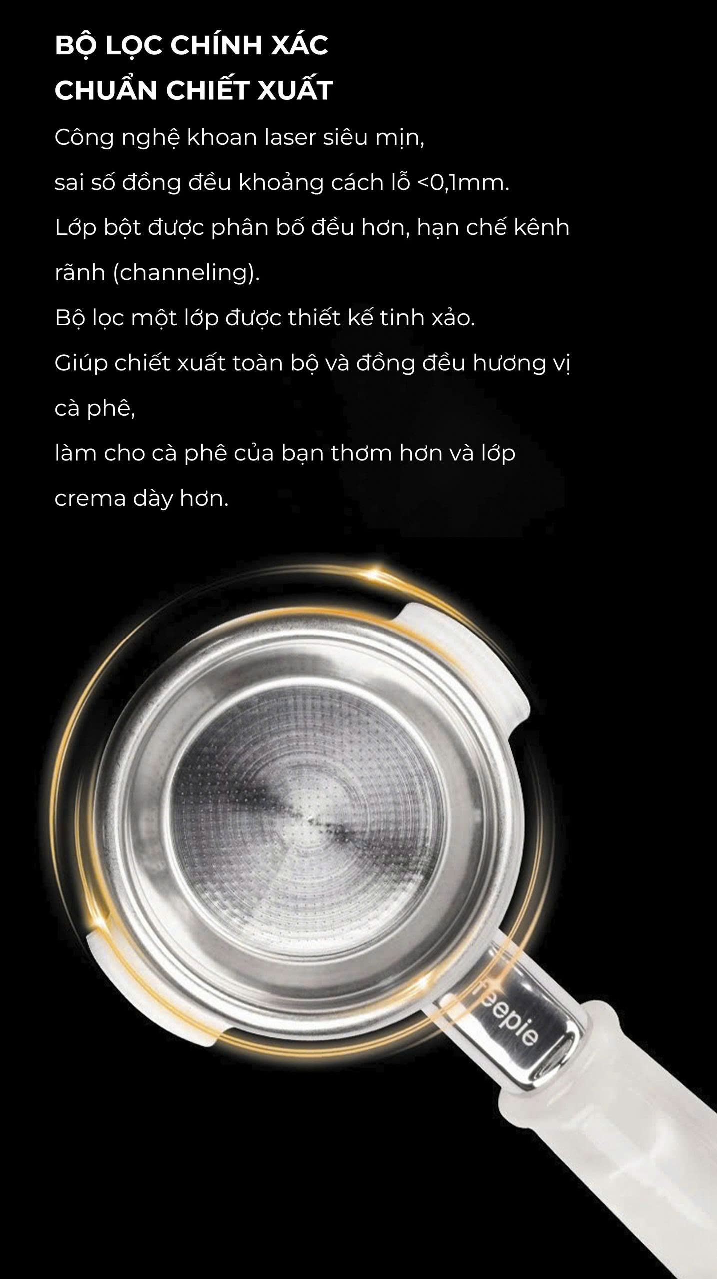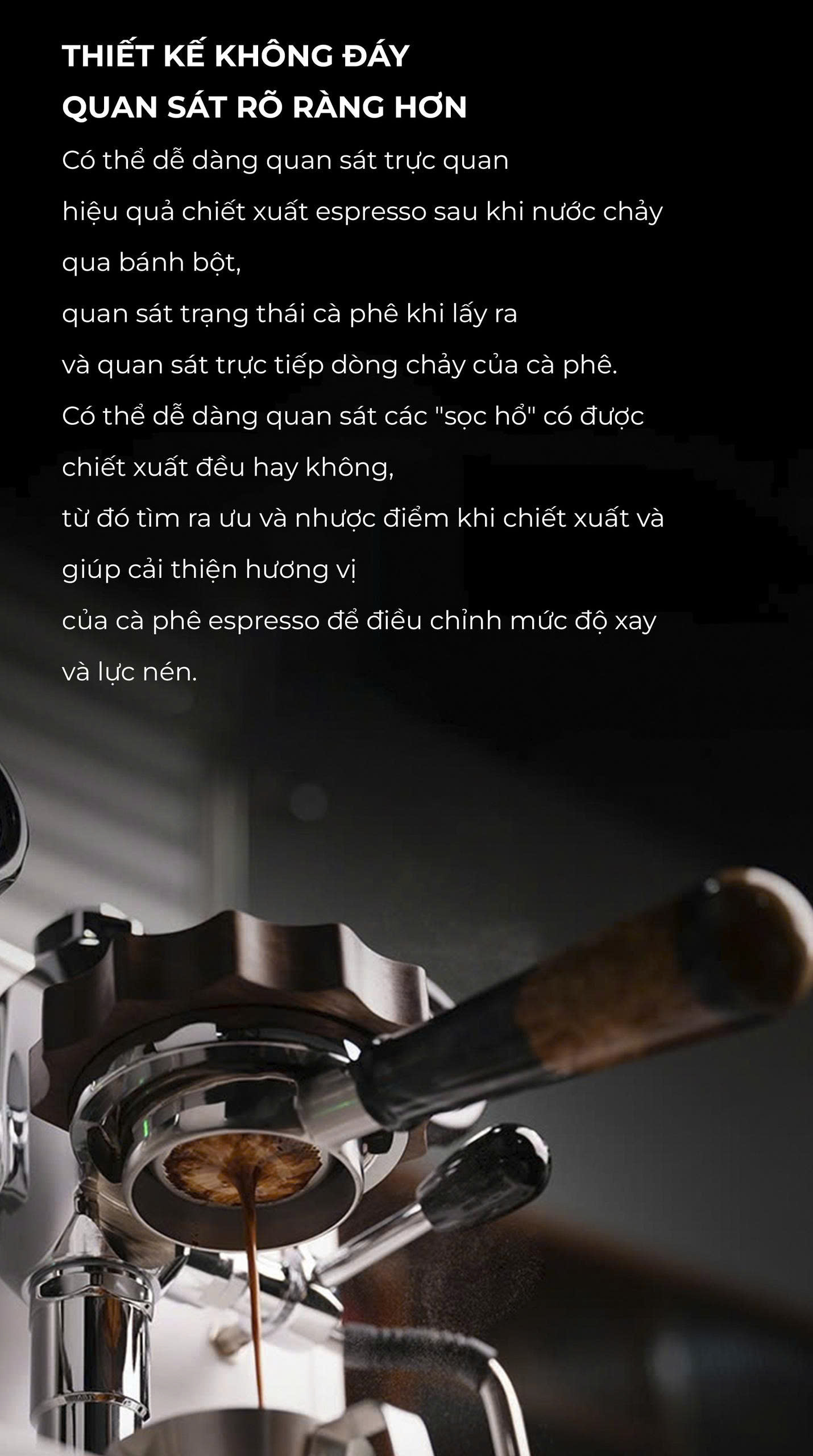 • Thiết kế không đáy: Mang lại trải nghiệm pha chế hoàn hảo, cho phép bạn quan sát và điều chỉnh quá trình chiết xuất cà phê dễ dàng.