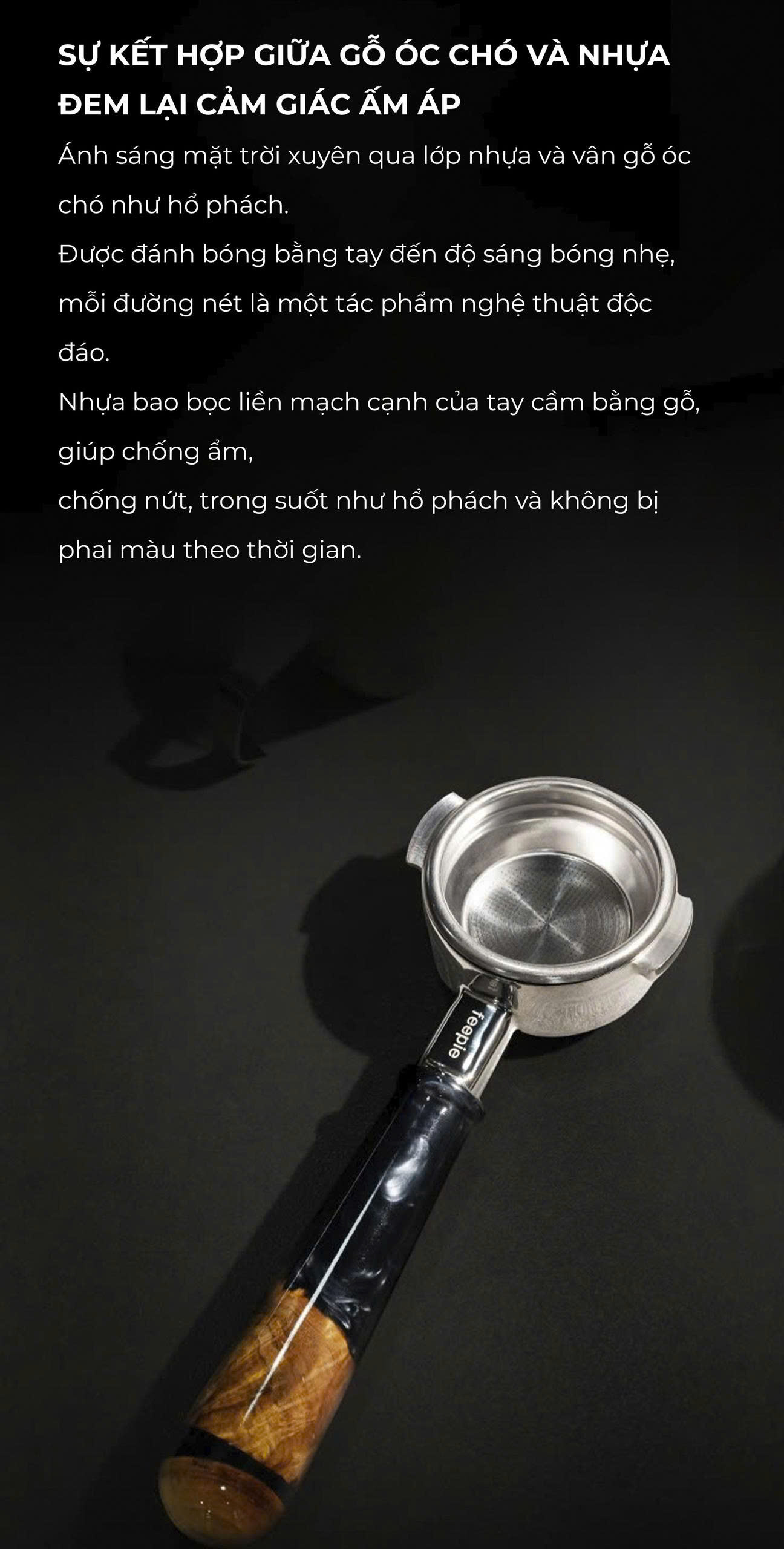Sự kết hợp tuyệt vời giữa gỗ óc chó và nhựa cao cấp mang đến cho bạn trải nghiệm pha chế espresso đẳng cấp. Tay cầm thiết kế không đáy giúp bạn quan sát quá trình chiết xuất cà phê rõ ràng, kiểm soát chất lượng nước trong mỗi tách cà phê.