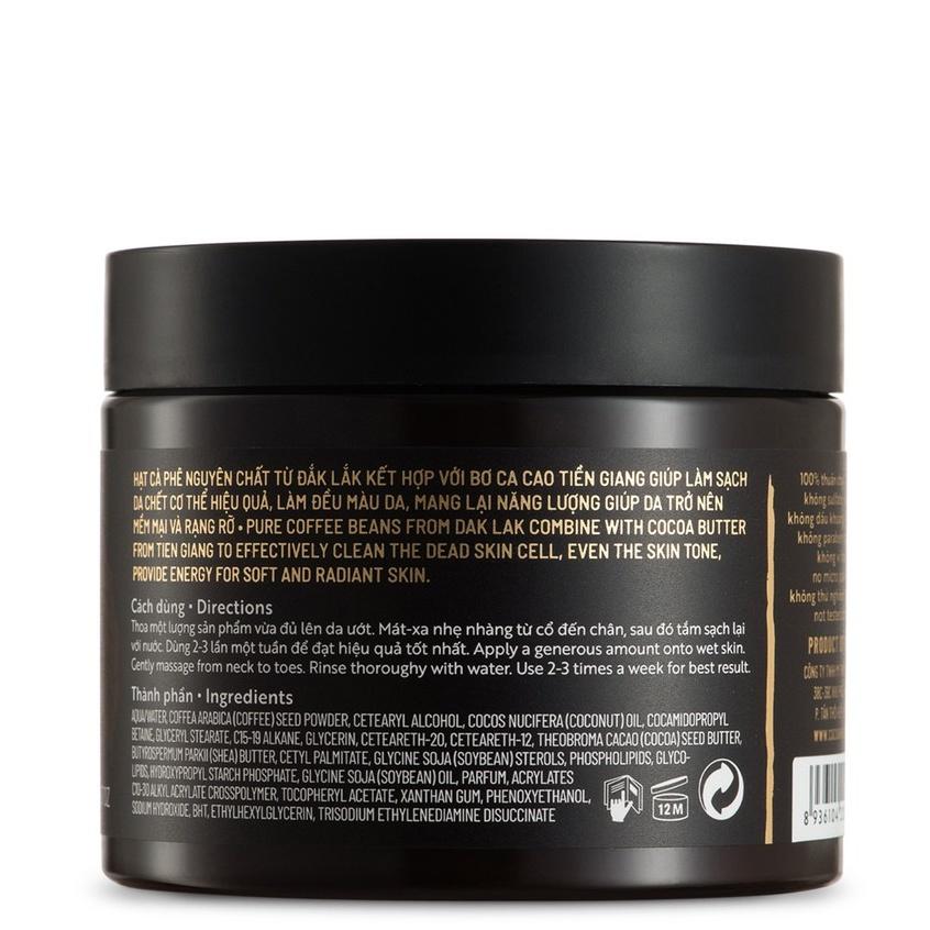 Sản phẩm được tạo từ những hạt cà phê Đăk Lăk nguyên chất xay nhuyễn, hòa quyện cùng bơ cacao Tiền Giang giúp làm sạch tế bào chết hiệu quả, làm đều màu da, mang