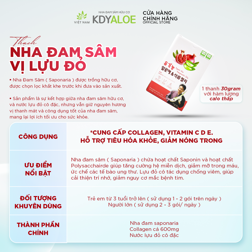 Thạch collagen nha đam saponaria lựu đỏ Hữu cơ làm đẹp da, tăng cường hệ miễn dịch * Thương hiệu: KDY Aloe * Xuất xứ: Hàn Quốc * Quy cách: 30 gói/ set * Dung
