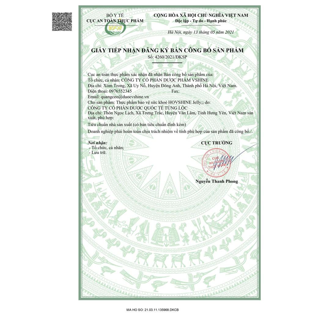 - Thạch Hovshine Jelly được sản xuất tại công ty Cổ phần Dược Quốc Tế Tùng Lộc trên dây chuyền công nghệ hiện đại đạt chuẩn GMP – WHO và phân phối chính thức công ty Dược phẩm VSHINE. Thành phần Thạch Hovshine Jelly: Trong 1 gói 12g thạch có chứa: