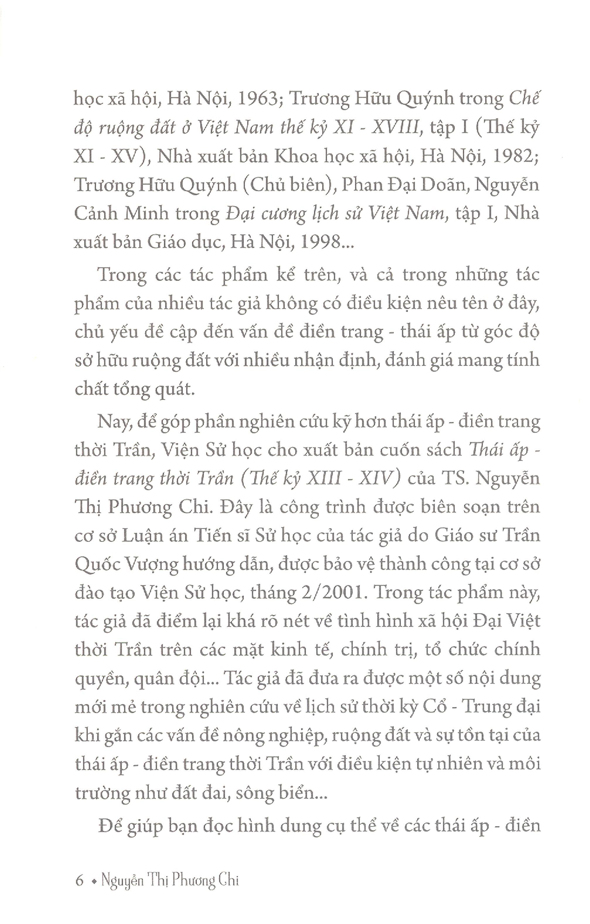 Sự tồn tại của các thái ấp – điền trang là một trong những đặc điểm nổi bật góp phần tạo nên cơ sở kinh tế - xã hội thời Trần, một thời kỳ hiển hách trong lịch sử dân tộc với võ công ba lần kháng chiến thắng lợi chống quân xâm lược Mông – Nguyên. Trong công trình “Thái ấp – điền trang thời Trần (thế kỷ XIII-XIV)”, qua việc điểm lại rõ nét về tình hình xã hội Đại Việt thời Trần trên các mặt kinh tế, chính trị, tổ chức chính quyền, quân độ tác giả Nguyễn Thị Phương Chi đã đưa ra được một số nội dung mới mẻ trong nghiên cứu về lịch sử thời kỳ Cổ - Trung đại khi gắn các vấn đề nông nghiệp, ruộng đất và sự tồn tại của thái ấp – điền trang thời Trần với điều kiện tự nhiên và môi trường như đất đai, sông biể Tác giả đã đưa ra nhiều nhận xét, đánh giá khá táo bạo về vai trò của các thái ấp – điền trang thời Trần, nêu ý nghĩa tích cực của các loại hình này trong việc kết hợp nhiệm vụ xây dựng và bảo vệ đất nước thời Trần, nhất là khi cả dân tộc dồn sức chống xâm lược. Đồng thời, tác giả cũng nêu những hạn chế của chế độ thái ấp và điền trang đã gây nên tình trạng phân tán là điều mâu thuẫn với xu hướng tập quyền thời bấy giờ.
