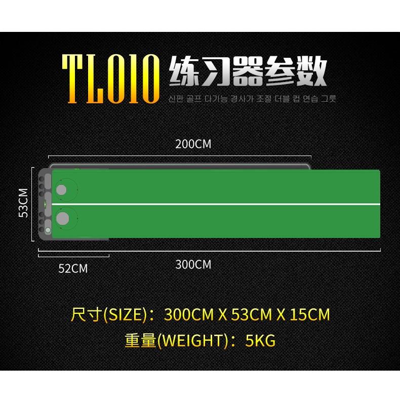 - Kích thước: Thảm tập Putting TL010 có chiều dài 3.0m, chiều rộng 53cm. - Phần thảm cỏ đế Eva dày 1cm. 2 lỗ Golf có đường kính lần lượt là 6.5cm và 8cm. Khung thảm nhựa cao 15cm gồm nhiều đoạn nhỏ bên phía sườn thảm ghép lại.