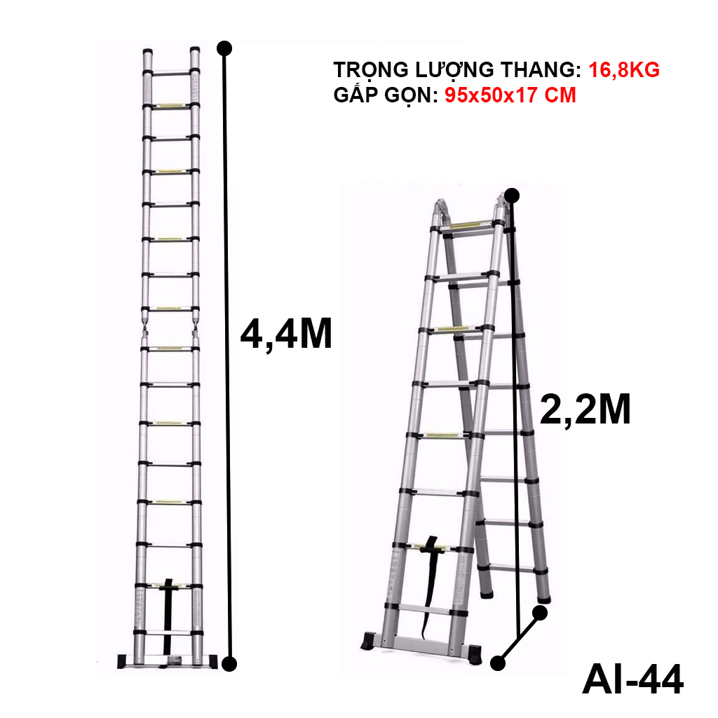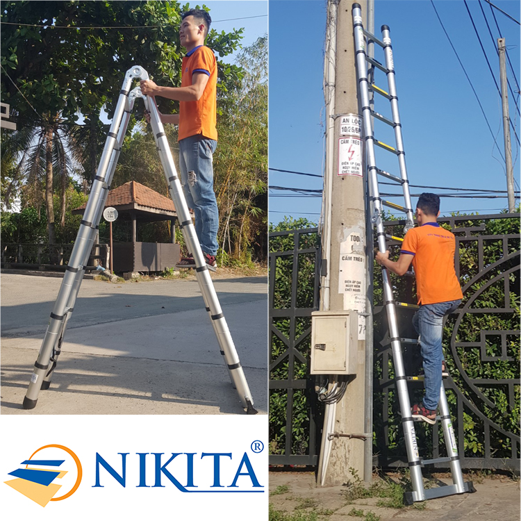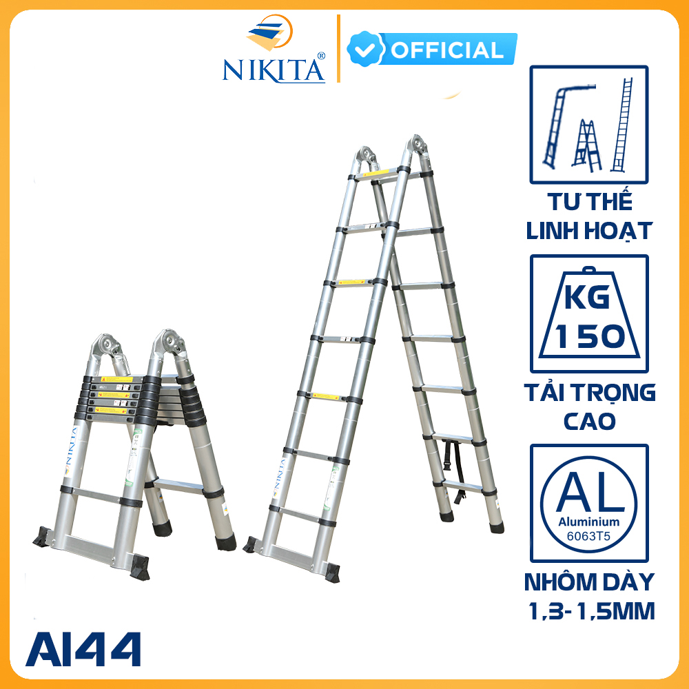 THANG NHÔM RÚT ĐÔI NIKITA       Thang nhôm rút NIKITA là loại thang được sử dụng phổ biến trong đời sống và công nghiệp. Thang có thiết kế linh hoạt, có thể thu gọn hoặc mở rộng chiều cao tùy theo nhu cầu sử dụng. Dưới đây là 4 ưu điểm nổi bật của thang nhôm rút NIKITA:   1 - Thiết kế nhỏ gọn, tiện lợi Thang nhôm rút NIKITA: có thiết kế đặc biệt, có thể thu gọn chiều cao xuống chỉ còn 100 cm. Điều này giúp thang dễ dàng di chuyển và cất giữ, tiết kiệm diện tích.   2 - Chiều cao linh hoạt Thang nhôm rút NIKITA: có thể được điều chỉnh chiều cao một cách linh hoạt, phù hợp với nhiều nhu cầu sử dụng khác nhau. Chiều cao thang có thể lên tới 6m, đáp ứng được các công việc đòi hỏi độ cao lớn.   3 - Chất liệu bền bỉ Thang nhôm rút NIKITA: thường được làm bằng chất liệu nhôm cao cấp, có độ bền cao, chống chịu được các tác động của môi trường như mưa, nắng, gió,...   4 - An toàn khi sử dụng Thang nhôm rút NIKITA:ss được trang bị các chốt khóa an toàn, giúp thang luôn được cố định chắc chắn trong quá trình sử dụng. Ngoài ra, chân thang được bọc nhựa chống trơn trượt, đảm bảo an toàn cho người dùng.   CHI TIẾT SẢN PHẨM: Kích thước đóng hộp: 110x50x20 cm Chất liệu : Nhôm + Plastic Màu sắc : Ống trắng + Đai nhựa đen Tải trọng 200kg, tiêu chuẩn châu Âu EN131 KHOÁ THANG: Thang nhôm khóa tự động khi mở đến cữ tự động khóa sập lại CHÂN THANG: Thang có chân ngang giúp cố định thang chắc chắn khi leo trèo. Chân thang được bọc bằng cao su giúp chống trượt và chống trầy xước sàn nhà của bạn. Khoảng cách giữa các bậc thang rất ngắn 30cm giúp việc sử dụng thang được dễ dàng, an toàn Thang nhôm rút đa năng Nikita với thiết kế nhỏ gọn, linh hoạt trong sử dụng, có độ bền chắc chắn, tải trọng cao, an toàn sử dụng cả khi duỗi thẳng. Thích hợp trong thi công ở những vị trí cao, hẹp hoặc dùng dễ dàng khi cần kê thang ở bậc tam cấp.   THÔNG SỐ KỸ THUẬT THANG AI-44 -Chiều cao thang lúc chữ A: 2.2m -Chiều cao thang lúc chữ I: 4.4m -Kích thước gấp gọn: 95x50x17 cm -Trọng lượng thang: 16.8kg   HÌNH ẢNH THẬT SẢN PHẨM