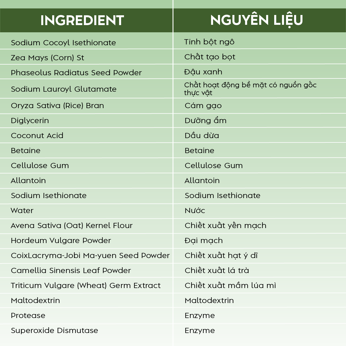● Ngũ cốc chiết xuất từ thiên nhiên (lúa mạch, ngô, mầm lúa mì, yến mạch, cám gạo, ý dĩ, đậu xanh): làm sạch lỗ chân lông, loại bỏ tế bào ch ết dạng vật lý, làm mềm mịn, dưỡng ẩm, tăng khả năng miễn dịch tự nhiên cho da