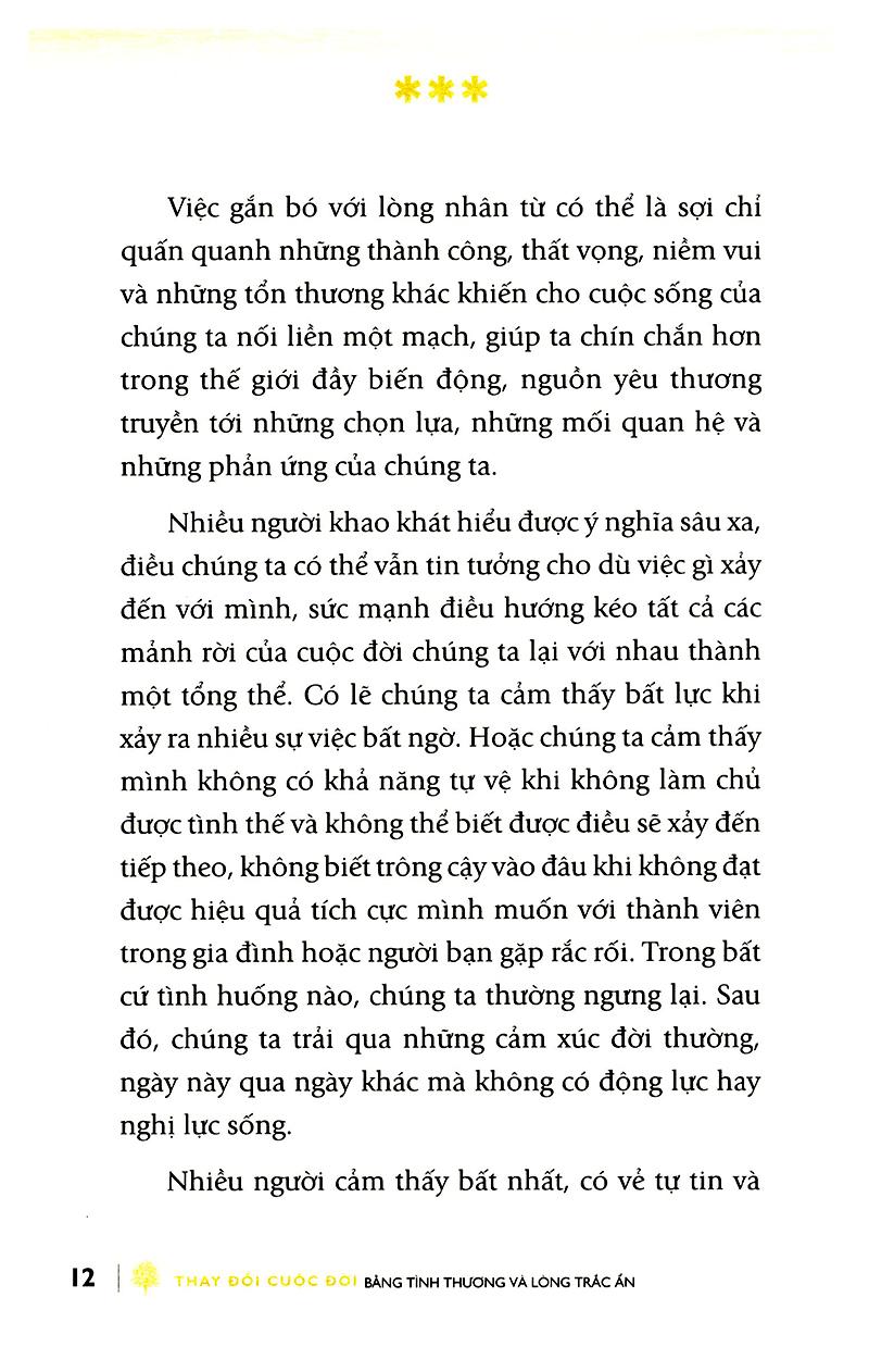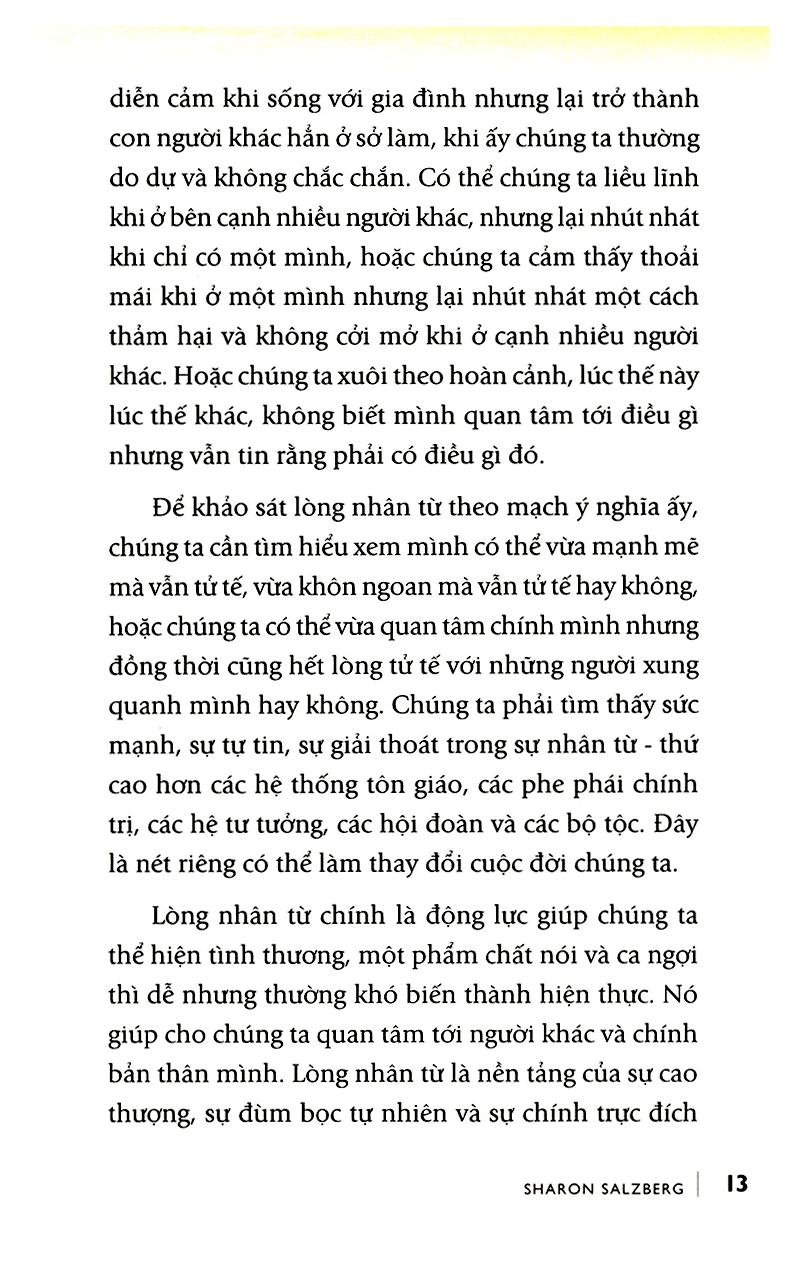Điều gì sẽ xảy ra nếu lòng tốt và sự bao dung là kỹ năng tiềm ẩn mà bạn có thể phát triển? Với sách Thay đổi cuộc đời bằng tình thương và lòng trắc ẩn, Sharon Salzberg hướng dẫn độc giả trải nghiệm quá trình khám phá sức mạnh đích thực của lòng nhân ái và sử dụng nó làm hướng đi cho cuộc sống hàng ngày. Qua sách những câu chuyện mang tính giáo huấn, những hiểu biết sâu sắc từ những năm tháng làm chuyên gia hướng dẫn thiền định của Sharon và qua những bài tập thực hành, bạn sẽ học được cách nuôi dưỡng sự thanh thản, mở rộng trái tim đồng cảm và thể hiện sức mạnh của tình yêu thương tới mọi người.