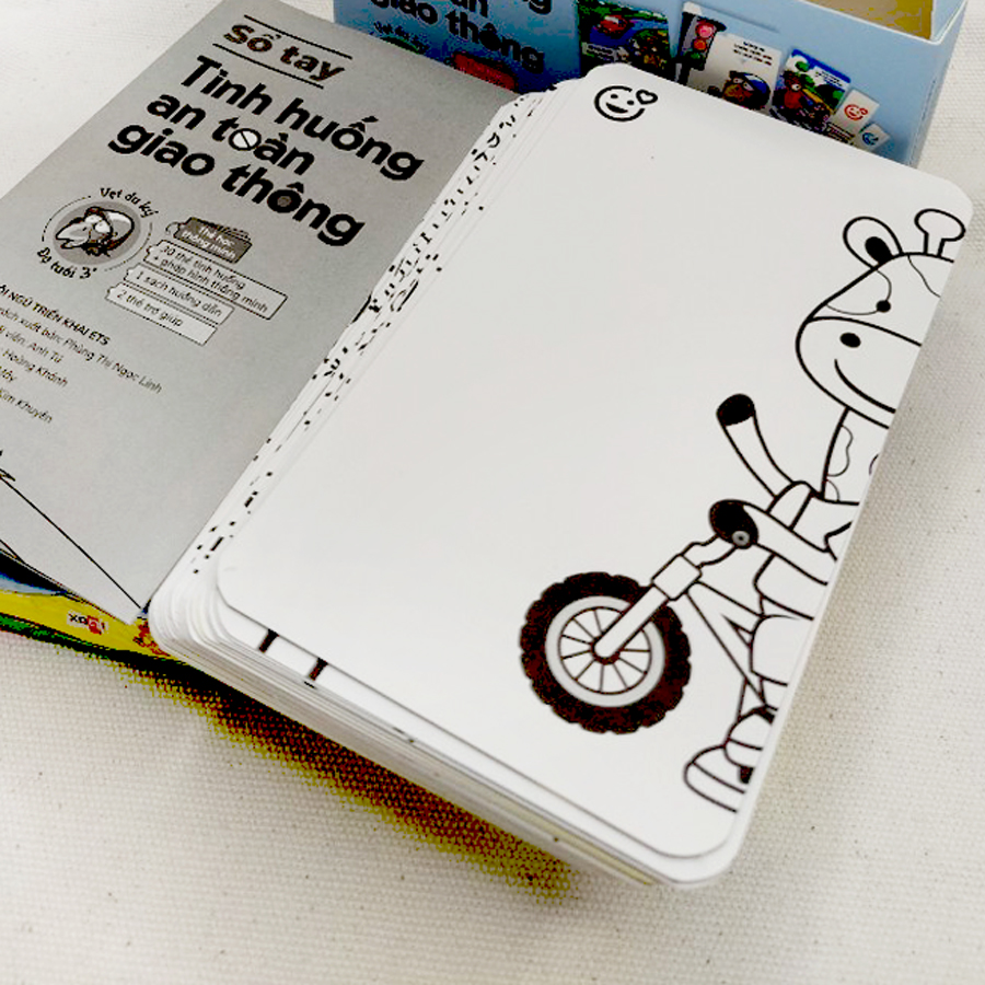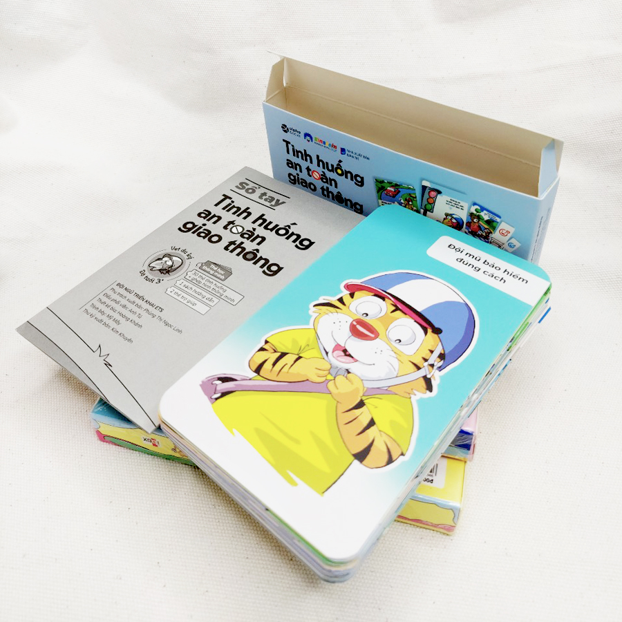 Bao gồm: 30 thẻ tình huống an toàn giao thông, 2 thẻ trợ giúp, 1 sổ tay hướng dẫn, tặng kèm Sticker. Bộ thẻ là câu chuyện của Vẹt con và các bạn khi tham gia giao thông, giúp bé bước đầu làm quen và hiểu luật để đi đường an toàn hơn. Mặt trước là 30 thẻ tình huống vui nhộn và gần gũi, đề cập đến những tình huống thường gặp nhất khi bé tham gia giao thông. Với sự hỗ trợ của 2 thẻ trợ giúp, bé thỏa thích khám phá để nhận biết và phân biệt tình huống đúng – sai qua hình minh họa sinh động và ghi chú chi tiết trên từng thẻ. Mặt sau thẻ là trò chơi ghép hình thú vị. Bé tự do tìm tòi ghép hình hoặc lồng ghép vào các trò chơi được thiết kế sẵn cho bộ thẻ. Bên cạnh đó, mặt sau còn có ký hiệu của 2 thẻ trợ giúp, bé dễ dàng kiểm tra lại đáp án khi chơi một mình hoặc chơi cùng bạn bè.