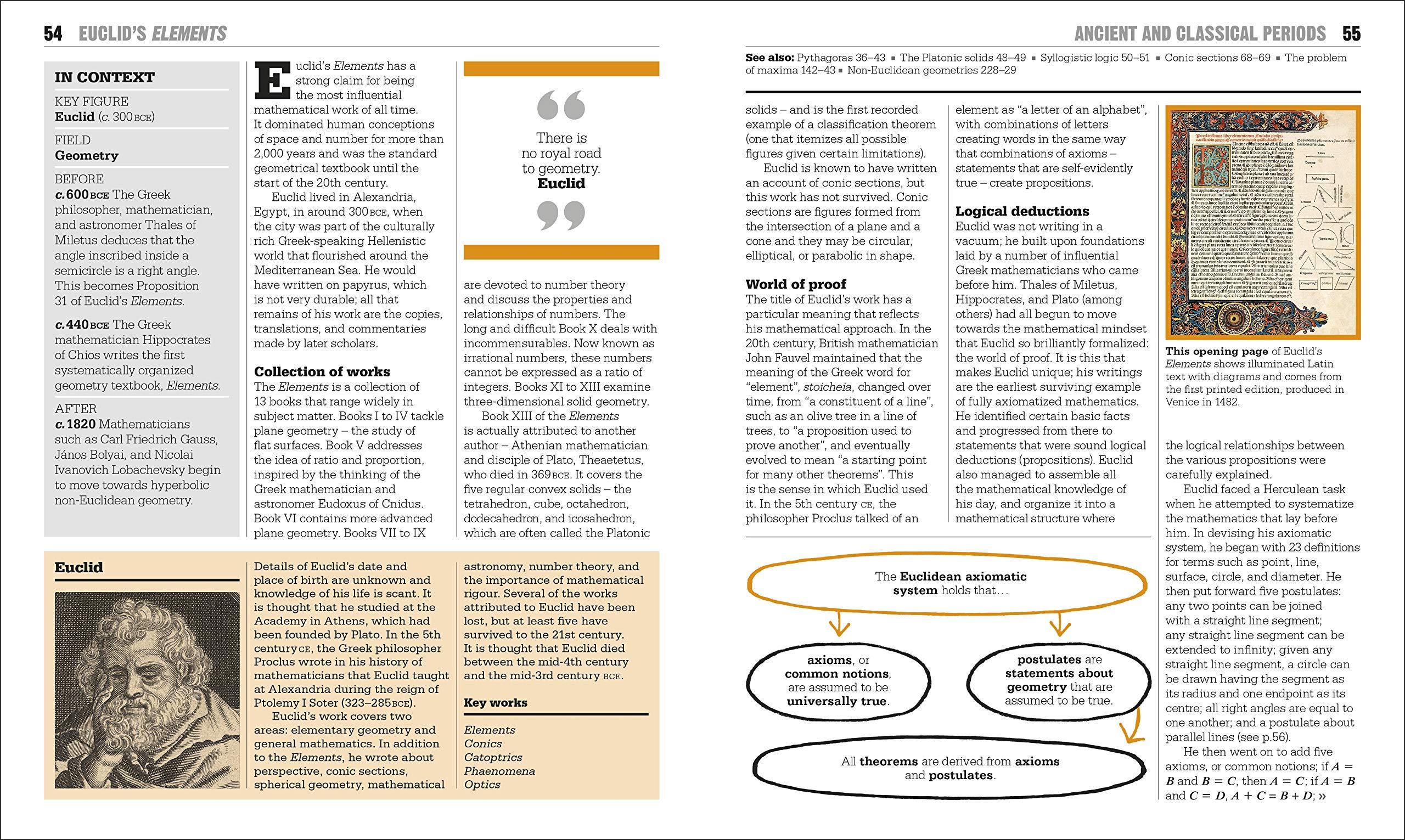 A vibrant exploration of the world's most famous and important mathematical ideas, theorems, and movements, and the great minds behind them.Take a journey through the intriguing story of numbers, patterns, and shapes in order to better understand the complex world we live in. Charting the development of maths around the world from Babylon to Bletchley Park, The Maths Book explores and explains more than 85 of the most complex and fascinating mathematical subjects. This diverse and inclusive account of mathematics will have something for everybody. It examines the maths behind world economies, secret spies, and modern technology such as computers, the internet, and AI. But it also traces the history of maths, from the mathematical ideas and inventions of the ancient world such as the first number systems, magic squares, and the Chinese abacus, through the discovery of zero and Fermat's last theorem, to the rise of group theory in the 19th century. Continuing the "Big Ideas" series' trademark combination of authoritative, clear text and bold graphics, The Maths Book uses an innovative visual approach to make the subject accessible to everyone, casual readers and students alike .