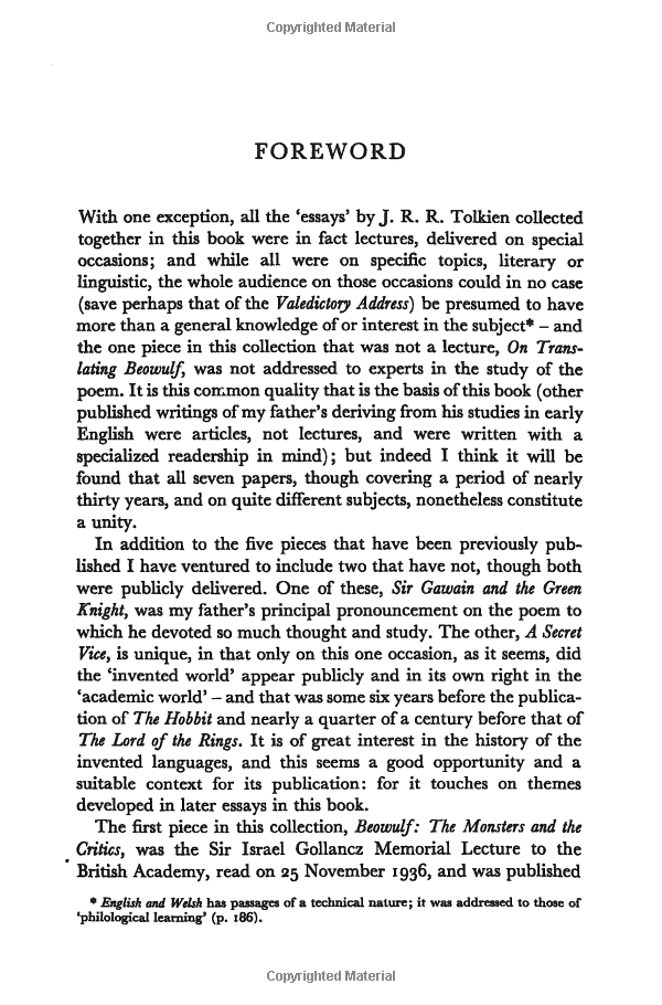 The pieces in this collection cover a period of nearly thirty years, beginning six years before the publication of The Hobbit, with a unique 'academic' lecture on his invention (calling it A Secret Vice) and concluding with his farewell to professorship, five years after the publication of The Lord of the Rings.