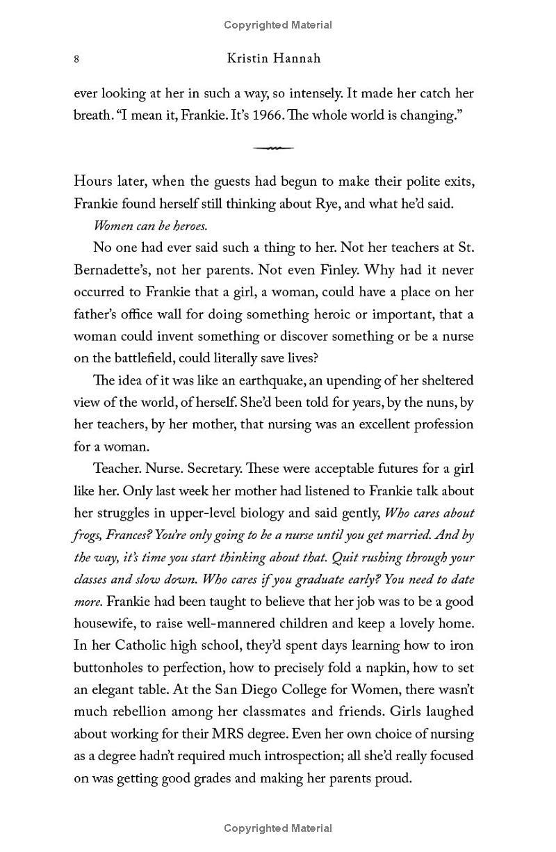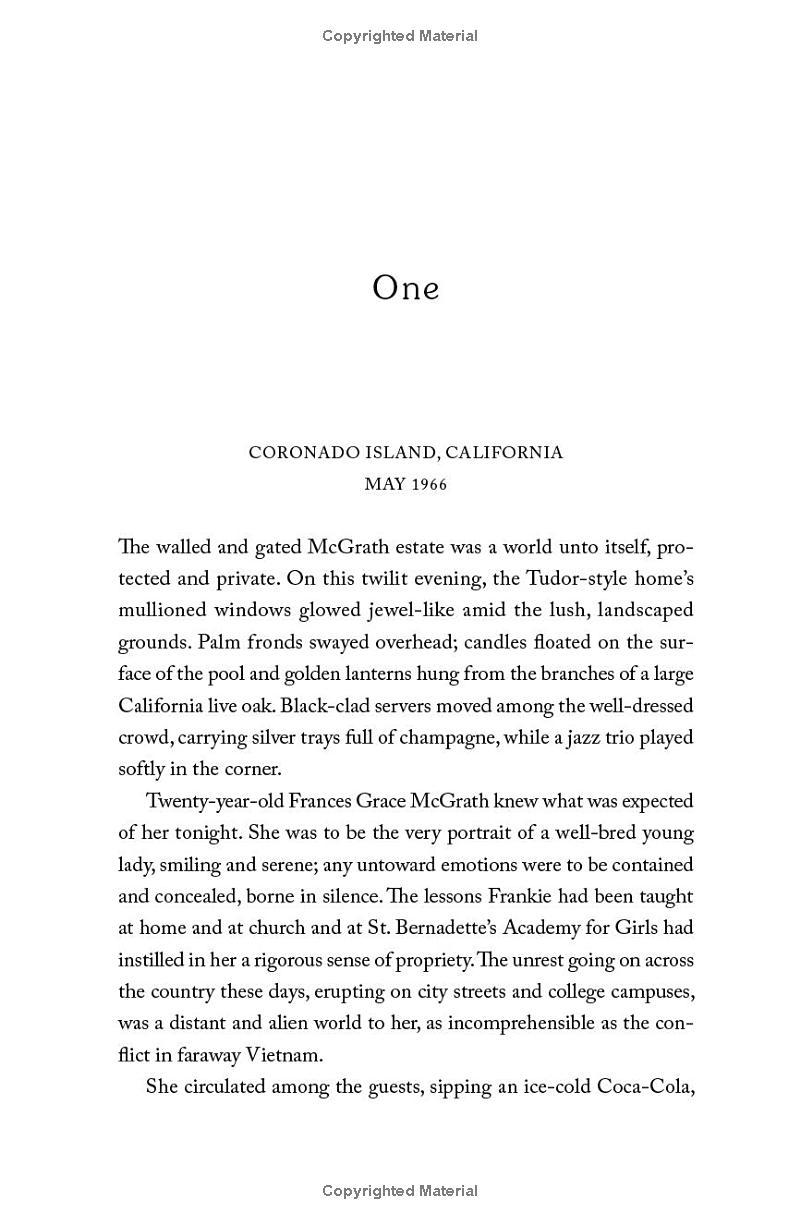 "Women can be heroes". When twenty-year-old nursing student, Frances “Frankie” McGrath, hears these unexpected words, it is a revelation. Raised on California’s idyllic Coronado Island and sheltered by her conservative parents, she has always prided herself on doing the right thing, being a good girl. But in 1965 the world is changing, and she suddenly imagines a different path for her life. When her brother ships out to serve in Vietnam, she impulsively joins the Army Nurses Corps and follows his path.