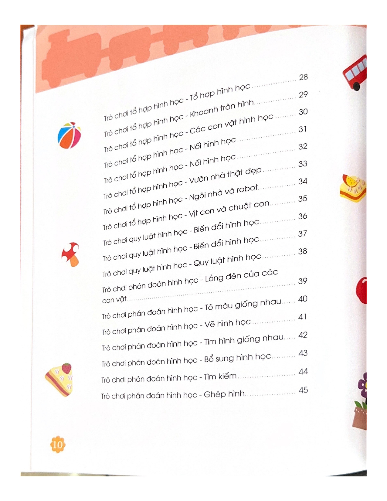 Bộ sách giúp trẻ biết so sánh, phân loại đồ vật, nhận biết các dạng hình học, không gian, thời gian, các con số và phép tính. Trẻ sẽ được gợi mở tiềm năng trí tuệ một cách tự nhiên nhất thông qua các bài tập với nhiều hình ảnh các con vật đáng yêu, trái cây giàu màu sắc, vật dụng quen thuộc hàng ngày,... Các bậc phụ huynh sẽ không khỏi ngạc nhiên khi thấy các bé làm bài tập hoài mà không biết chán!