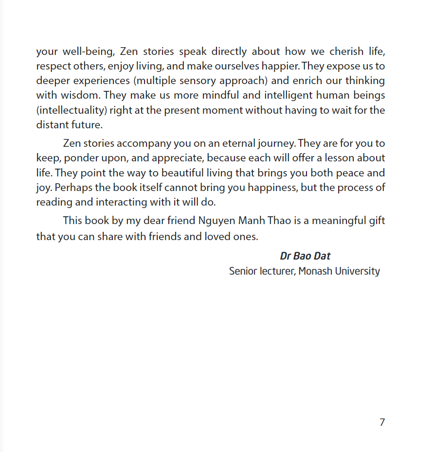 Mua tại TiktokQuyển Thiền truyện được biên soạn dựa trên quyển One Hand Clapping – Zen Stories for All Ages. Nhằm giúp người học dễ đọc, dễ hiểu và dễ nhớ, những cấu trúc câu phức tạp được đơn giản hóa, và từ vựng khó được thay thế bằng từ vựng đơn giản hơn. Người học có thể đọc một câu chuyện Thiền, tự mình dịch sang tiếng Việt và đối chiếu với phần dịch tham khảo. Người học cũng có thể kể lại câu chuyện theo ý mình hoặc theo một trật tự khác, đàm thoại với bạn học bằng tiếng Anh, nêu quan điểm phản biện của mình trong nhóm, rút ra bài học về nội tâm và cuộc sống hiện tại, vẽ tranh minh họa cho câu chuyện, sáng tạo những mẩu đàm thoại dựa theo nội dung câu chuyện.