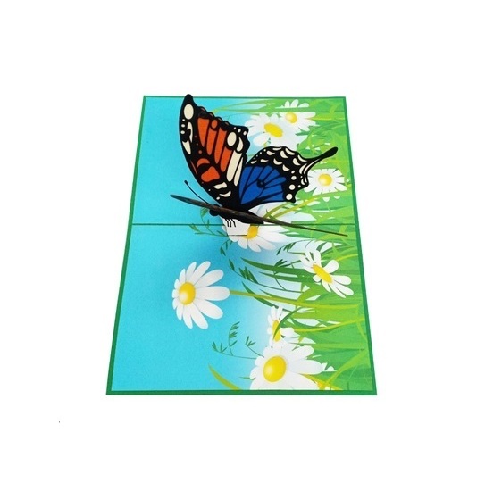 Gửi tặng điều bất ngờ với thiệp 3D bướm xanh giữa cánh đồng hoa cúc – biểu tượng của sự tự do, may mắn và niềm vui. Khi mở thiệp, hình ảnh chú bướm xanh