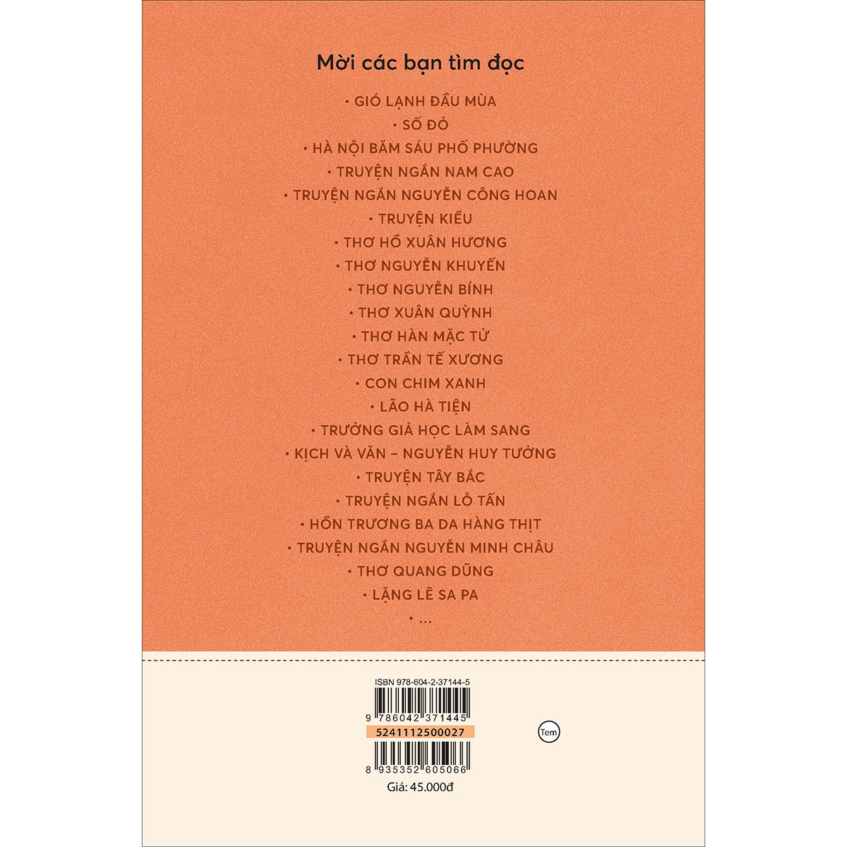 Mời các bạn tìm đọc: • Gió Lạnh Đầu Mùa • Số Đỏ • Hà Nội Băm Sáu Phố Phường • Truyện Ngắn Nam Cao • Truyện Ngắn Nguyễn Công Hoan • Truyện Kiều • Thơ Hồ Xuân Hương • Thơ Nguyễn Khuyến • Thơ Nguyễn Bính • Thơ Xuân Quỳnh • Thơ Hàn Mặc Tử • Thơ Trần Tế Xương • Con Chim Xanh • Lão Hà Tiện • Trưởng Giả Học Làm Sang • Kịch Và Văn – Nguyễn Huy Tưởng • Truyện Tây Bắc • Truyện Ngắn Lỗ Tấn • Hồn Trương Ba Da Hàng Thịt • Truyện Ngắn Nguyễn Minh Châu • Thơ Quang Dũng • Lặng Lẽ Sa Pa • …