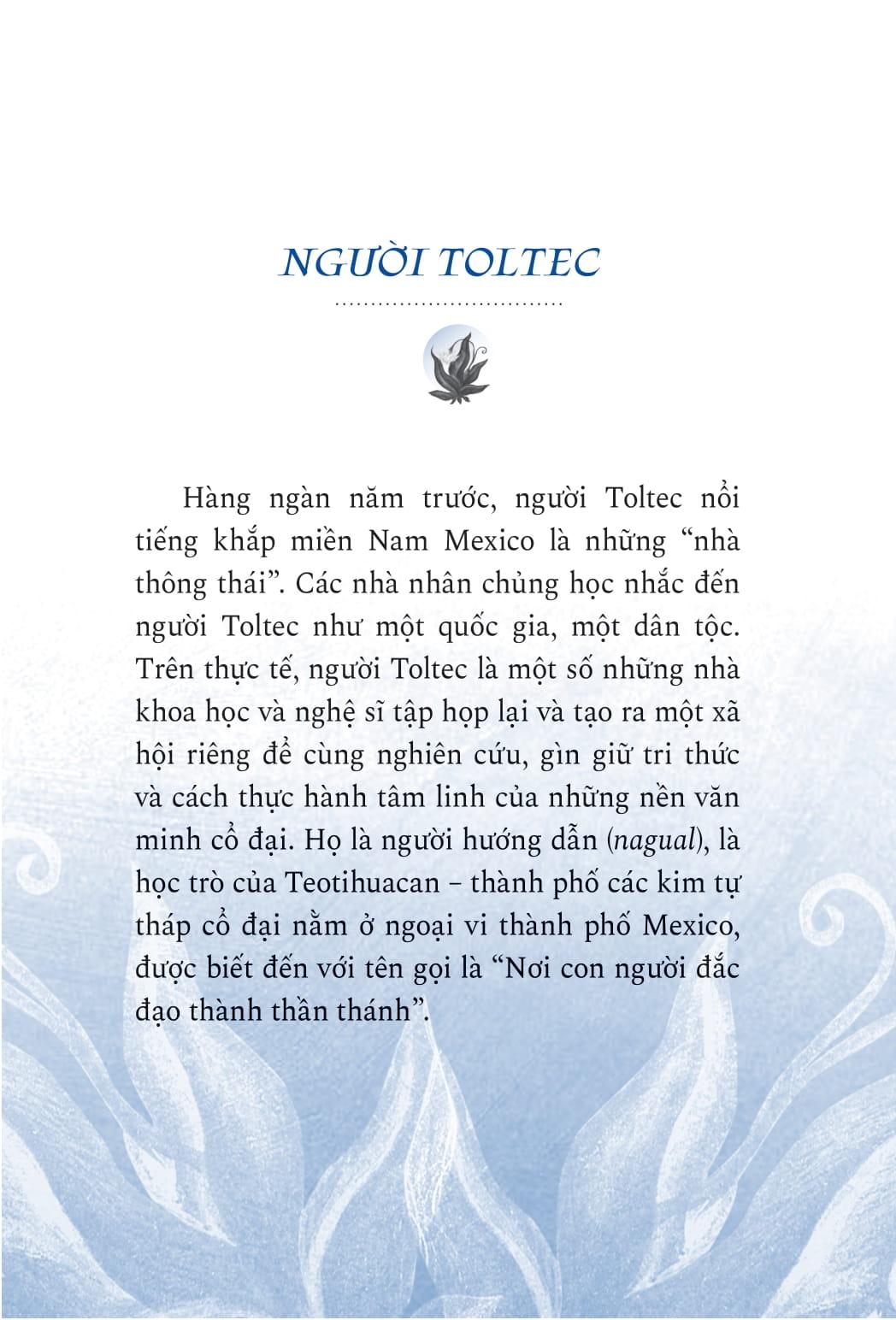 THỎA ƯỚC THỨ NĂM Tìm về bản thể chân thật Thỏa ước thứ năm - Thỏa ước tìm về bản thể chân thật của chính m.ình Trong Thỏa ước thứ năm, don Miguel Ruiz tham gia cùng con trai của m.ình, don Jose Ruiz, đưa ra một cái nhìn mới mẻ về Bốn thỏa ước, và một thỏa ước mới mạnh mẽ hơn để biến cuộc sống của chúng ta thành thiên đường riêng của chúng ta. Thỏa ước thứ năm đưa chúng ta đến mức độ nhận thức sâu hơn về sức mạnh của bản thân, và đưa chúng ta trở lại tính chân thật mà chúng ta được sinh ra. Cuốn sách đã thay đổi cuộc đời của hàng triệu người trên thế giới, chúng ta được nhắc nhở về món quà lớn nhất mà chúng ta có thể ban tặng cho bản thân: tự do trở thành con người thật của chính m.ình. don Miguel Ruiz cho ta biết hương vị tự do tốt đẹp như thế nào, cảm giác ngọt ngào khi trở thành con người thật của chúng ta và cuối cùng, tác giả khiến chúng ta nhận ra sức mạnh mà chúng ta có được khi cố gắng trở thành người đích thực. Chính bên trong chúng ta mới là chìa khóa dẫn đến hạnh phúc và chỉ khi thực sự hiểu m.ình là ai, chúng ta mới có thể đạt được tiềm năng tối đa của m.ình. Đã đến lúc bạn bắt đầu rèn luyện khả năng làm chủ bản thân. Thỏa ước thứ năm cung cấp cho bạn một hành trình mà bạn sẽ không bao giờ quên! don Miguel Ruiz - Hậu duệ của người Toltec cổ xưa Hàng ngàn năm trước, người Toltec nổi tiếng khắp miền Nam Mexico là những “nhà thông thái”. Các nhà nhân chủng học nhắc đến người Toltec như một quốc gia, một dân tộc. Trên thực tế, người Toltec là một số những nhà khoa học và nghệ sĩ tập họp lại và tạo ra một xã hội riêng để cùng nghiên cứu, gìn giữ tri thức và cách thực hành tâm linh của những nền văn minh cổ đại. Họ là người hướng dẫn (nagual), là học trò của Teotihuacan – thành phố các kim tự tháp cổ đại nằm ở ngoại vi thành phố Mexico, được biết đến với tên gọi là “Nơi con người đắc đạo thành thần thánh”. Trải qua nhiều thiên niên kỷ, các vị nagual bị bắt buộc giữ bí mật toàn bộ những lời dạy thông thái cổ xưa này. Trong thời kỳ chinh phục của châu u, một số cá nhân thực hành tâm linh đã trở nên lạm quyền, hung hăng. Vì vậy, các nagual không còn cách nào khác là giấu kín, tránh cho những lời dạy này rơi vào tay những kẻ cố tình lợi dụng để làm những điều không đúng. May thay, tri thức bí truyền này của người Toltec vẫn được truyền từ đời này sang đời khác trong gia tộc của các nagual. Và dù đã được giữ bí mật hàng trăm năm, những lời tiên tri cổ xưa đã dự đoán rằng những lời dạy thông thái này rồi sẽ được mở ra cho người dân. Và giờ đây, Miguel Ruiz, một vị nagual của dòng tộc Hiệp sĩ Đại Bàng, đã được Bề Trên lựa chọn để chia sẻ cho đại chúng những lời dạy đầy quyền năng này của người Toltec. Giống như các đạo giáo bí truyền khác trên thế giới, lời dạy của người Toltec cũng bắt nguồn từ chân lý chung của vũ trụ. Mặc dù không được xem là đạo giáo, nhưng người hướng dẫn lời dạy Toltec đều được tri tôn như những bậc thầy. Và mặc dù có tinh thần tương tự như đạo giáo, lời dạy Toltec có thể xem như một phong cách sống lấy hạnh phúc và tình yêu thương làm kim chỉ nam.