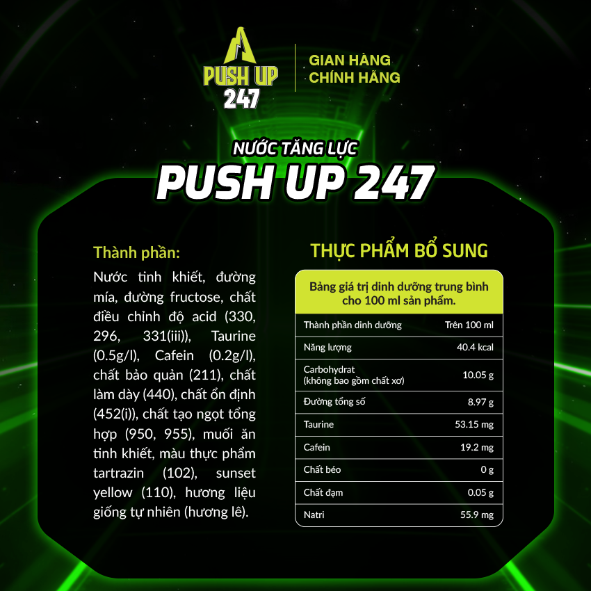Mua tại TiktokPUSH UP 247 chính thức ra mắt – Bùng nổ năng lượng, khai mở bản lĩnh Push Up 247 vừa xuất hiện với hướng đi khác biệt: kết hợp vị trái cây thanh mát với công thức năng lượng cân bằng, ít đường, không gây tích mỡ. Hương vị lê dịu nhẹ được phát triển dựa trên hàm lượng caffeine và taurine – mức vừa đủ để duy trì sự tập trung, không gây "quá kích" hay cảm giác bồn chồn. Push Up 247 vị Lê do Tập đoàn Hương Sen sản xuất Dòng sản phẩm này là đồng hành cùng người dùng trong các "thời điểm hiệu suất" – khi cần bật lại tinh thần để hoàn thành công việc, luyện tập hay học tập dài giờ: "Push Up vị Lê – Đam mê dẫn lối, cho 24/7 êm mượt" là thông điệp mà sản phẩm Push Up 247 muốn đồng hành cùng người tiêu dùng.