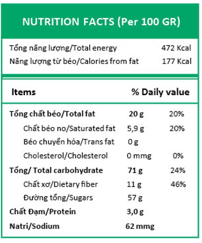 - Khi sử dụng chưa hết cần giữ kín bao bì và bảo quản trong ngăn mát tủ lạnh. Hạn sử dụng: 12 tháng kể từ ngày sản xuất. Nơi sản xuất: Nhà máy Hóc Môn - Hồ Chí Minh - Việt Nam, Quy trình chế biến: Nông sản được chọn lọc từ các vùng nguyên liệu tại Việt nam, làm sạch, sơ chế, cấp đông nhanh, sấy trong môi trường chân không, tại nhiệt độ thấp và được gói trong phòng sạch - tiêu chuẩn vi sinh với qui trình định lượng và đóng gói tự động với bao bì màng nhôm thực phẩm 3 lớp, tất cả được chế biến tại Nhà máy đạt chứng nhận ISO 22000 và HALAL với qui trình kiểm soát nghiêm ngặt HACCP.