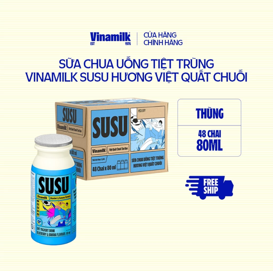 Mua tại TiktokĐể đảm bảo chất lượng sản phẩm tốt nhất, các đơn hàng bao gồm kem, sữa chua ăn và sữa chua uống sẽ chỉ được giao trong bán kính 10km từ cửa hàng Vinamilk gần nhất. Đơn hàng của bạn có thể sẽ được hủy nếu không có cửa hàng Vinamilk trong vòng bán kính 10km từ địa chỉ nhận hàng. Sữa chua uống Vinamilk SuSu mới – công thức đột phá Vitamin A giúp bé mắt sáng tinh anh, ngoài ra còn có Vitamin B6, B12 và chất xơ hòa tan giúp bé khỏe mạnh và năng động mỗi ngày. Sữa Chua uống Vinamilk SuSu – Sáng trí tinh anh Bao bì thay đổi tùy theo đợt nhập hàng