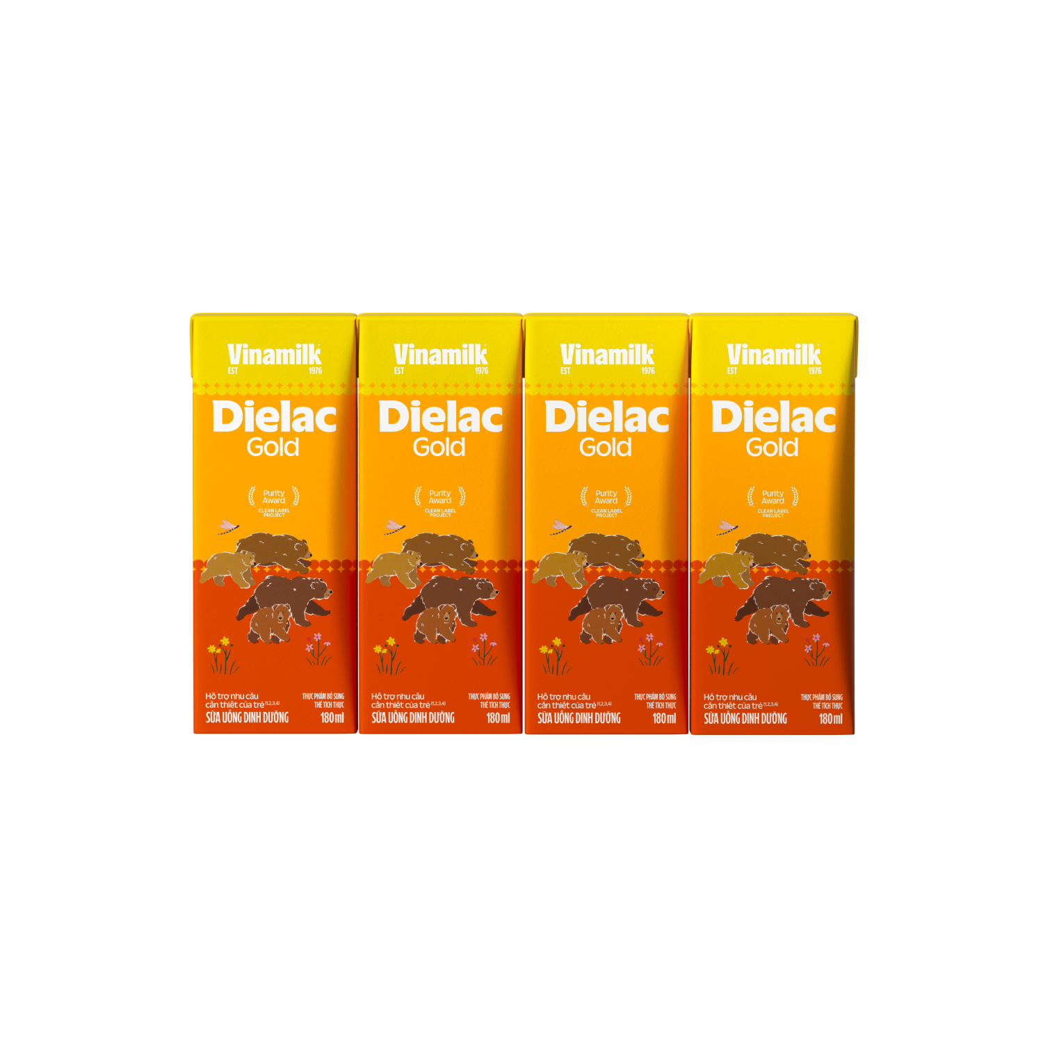 MÔ TẢ SẢN PHẨM Quy cách thùng: 12 lốc/ thùng   Tên sản phẩm: Thực phẩm bổ sung Sữa uống dinh dưỡng (Sữa bột pha sẵn) Dielac Alpha Gold - Lốc 4 hộp x 180ml   Dielac Alpha Gold đặc chế hỗ trợ phát triển trí não với công thức Opti-Grow IQ là sản phẩm ứng dụng thành công Lutein từ nghiên cứu của tập đoàn dinh dưỡng DSM, Thụy Sĩ, được bổ sung Lutein với hàm lượng DHA tăng gấp đôi cùng các dưỡng chất thiết yếu khác như ARA, Cholin, Omega 3, Omega 6 theo các tiêu chuẩn quốc tế: • Hàm lượng DHA đáp ứng 100% theo khuyến nghị của WHO/FAO: áp dụng cho Step 1, 2 • 3 ly mỗi ngày + bữa ăn thường ngày của bé đáp ứng 100% hàm lượng DHA tiêu chuẩn AFSSA của Pháp: áp dụng cho Step 3, 4, 5 • Đáp ứng 100% tiêu chuẩn quốc tế CODEX về vệ sinh thực phẩm với hàm lượng thành phần dinh dưỡng của sữa bột công thức Dielac Alpha Gold, Sữa bột pha sẵn, với công thức Opti-Grow IQ hỗ trợ:   •  PHÁT TRIỂN TRÍ NÃO: Các thành phần Axít Alpha-linolenic, Axit Linoleic, Taurin, Cholin, Sắt, DHA & ARA kết hợp với Lutein trong Dielac Alpha Gold bổ sung các dưỡng chất cần thiết cho sự phát triển của não bộ, võng mạc mắt, tăng khả năng nhận thức & ghi nhớ của trẻ.     •  TĂNG CƯỜNG SỨC ĐỀ KHÁNG: Dielac Alpha Gold sử dụng Sữa non Colostrum - sữa bò được vắt ra trong 48 giờ đầu sau khi sinh - chứa rất nhiều kháng thể và các vi chất Kẽm, Selen, Vitamin A, D3, C giúp tăng sức đề kháng của trẻ, bảo vệ trẻ luôn khỏe mạnh, chống lại các bệnh nhiễm khuẩn.     •  HỖ TRỢ SỨC KHỎE HỆ TIÊU HÓA: Tỉ lệ đạm Whey:Casein (60:40) cung cấp đầy đủ axit amin thiết yếu và cân đối, giúp hệ tiêu hóa còn non yếu của trẻ hấp thu đạm sữa được tốt nhất. Chất xơ hòa tan Inulin & Oligofructose (FOS), giúp tăng cường hệ vi khuẩn có lợi cho đường ruột, hỗ trợ hệ tiêu hóa khỏe mạnh, giúp nhuận tràng từ đó hấp thu các chất dinh dưỡng tốt hơn.     •  PHÁT TRIỂN THỂ CHẤT - CHIỀU CAO: Tỉ lệ Canxi & Phốt pho (Ca:P) thích hợp cùng với hàm lượng Vitamin D3 và các khoáng chất (Kali, Magiê...) cao giúp hệ xương và răng chắc khỏe, trẻ phát triển tốt về chiều cao.   Sản phẩm dành cho trẻ từ 1 tuổi trở lên.   MẪU BAO BÌ THAY ĐỔI THEO TỪNG ĐỢT NHẬP HÀNG.